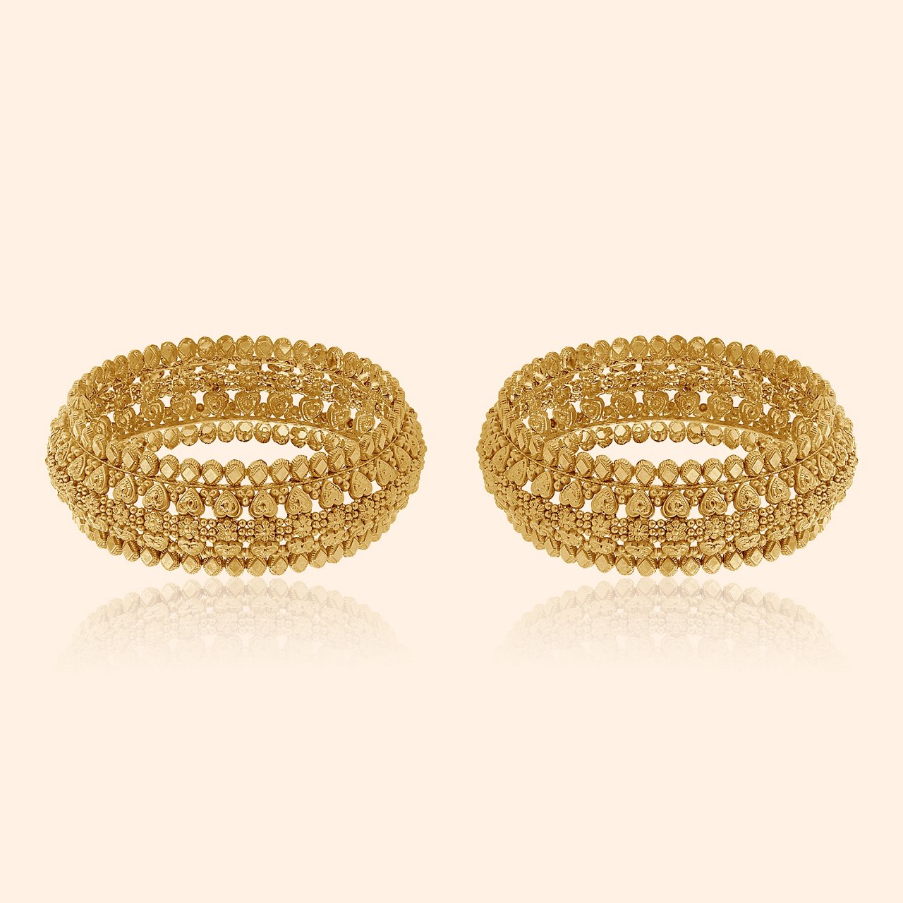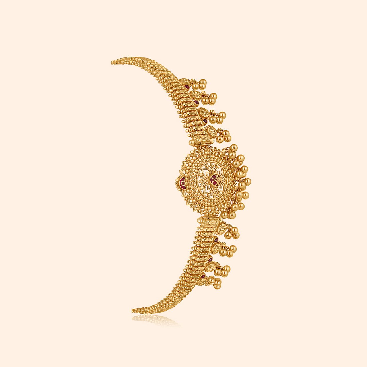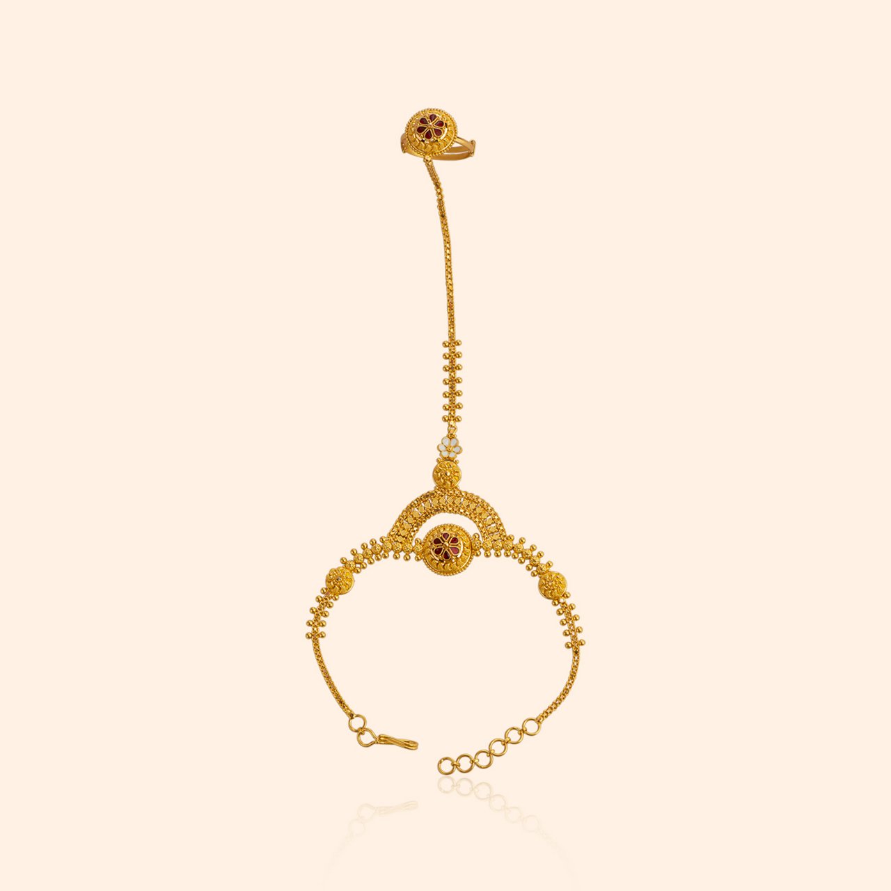 Add Regal Segment Gold Bangle – 22KT yellow gold with granulated segments, clear stones, red gemstones, and antique finish for grand lehengas or silk sarees. Complete with Raahi Gold Haathphool – 22KT yellow gold blending floral motifs, geometric design, and rich red accents telling stories of love's gentle light.
