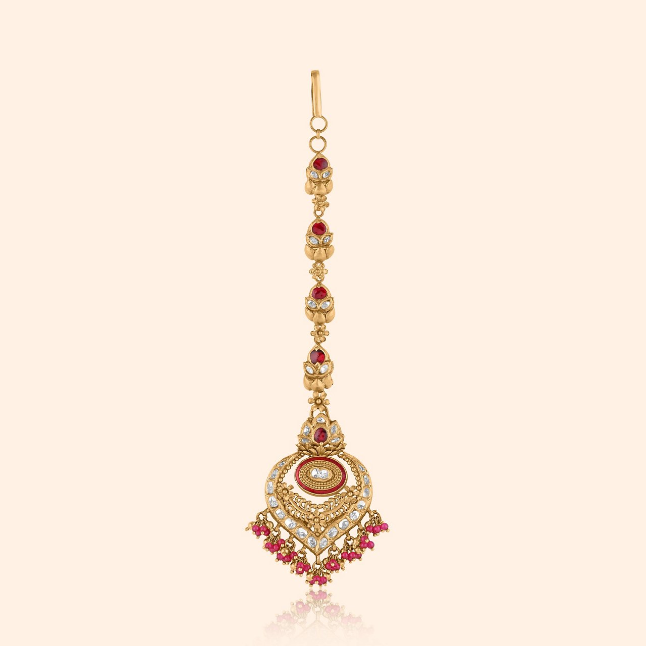 Pair it with Udaya Gold Bridal Drop Earrings – 22KT yellow gold drops with antique finish, coloured gemstones, and timeless heritage charm symbolizing auspicious beginnings. Add Adira Temple Gold Ring – 22KT yellow gold vanki-style ring with floral carvings, beadwork, and elongated shield shape declaring South Indian heritage. Complete with Temple Gold Maang Tikka – 18KT gold ornate discs inspired by temple architecture, evoking traditional craftsmanship with gilded motifs that make the heart sing.