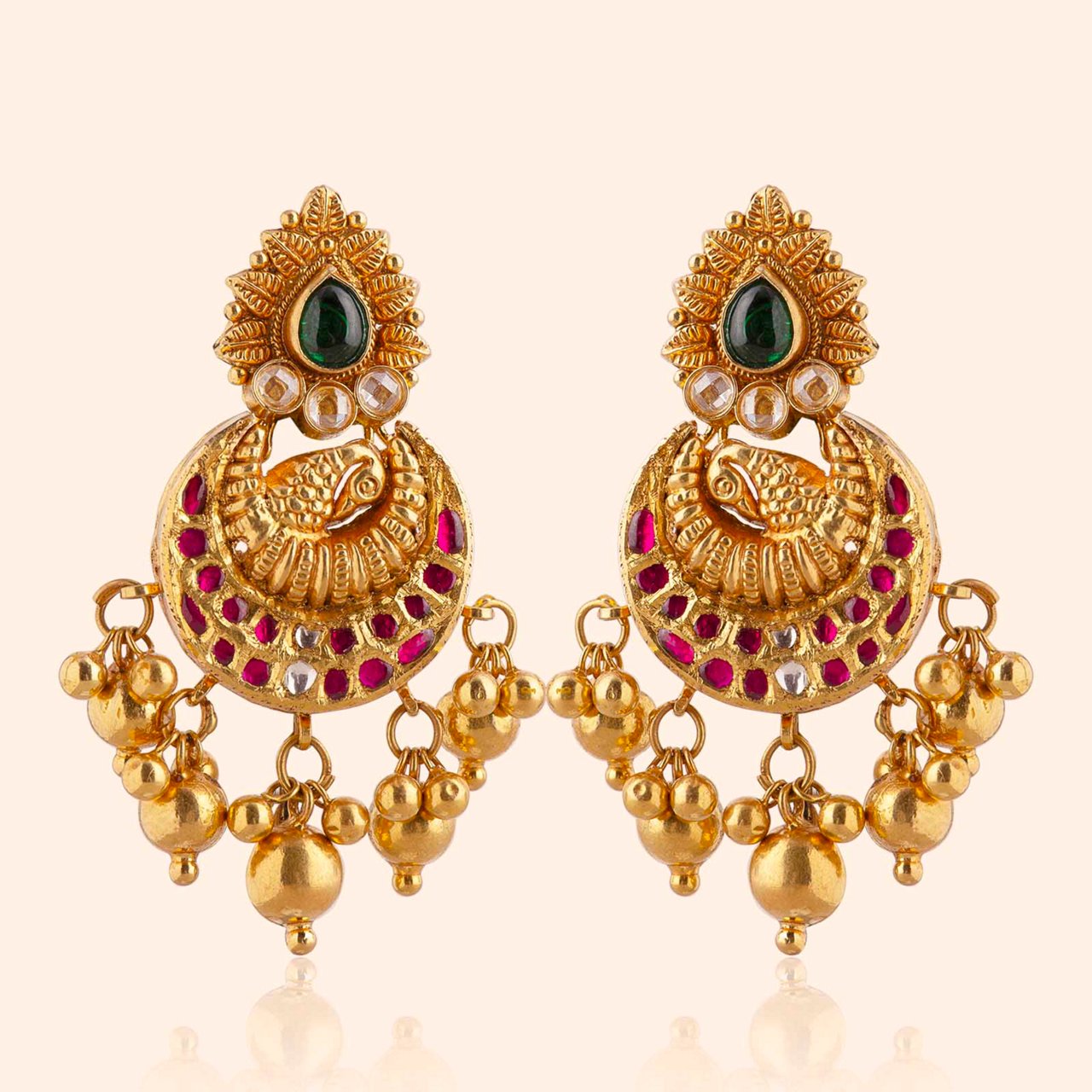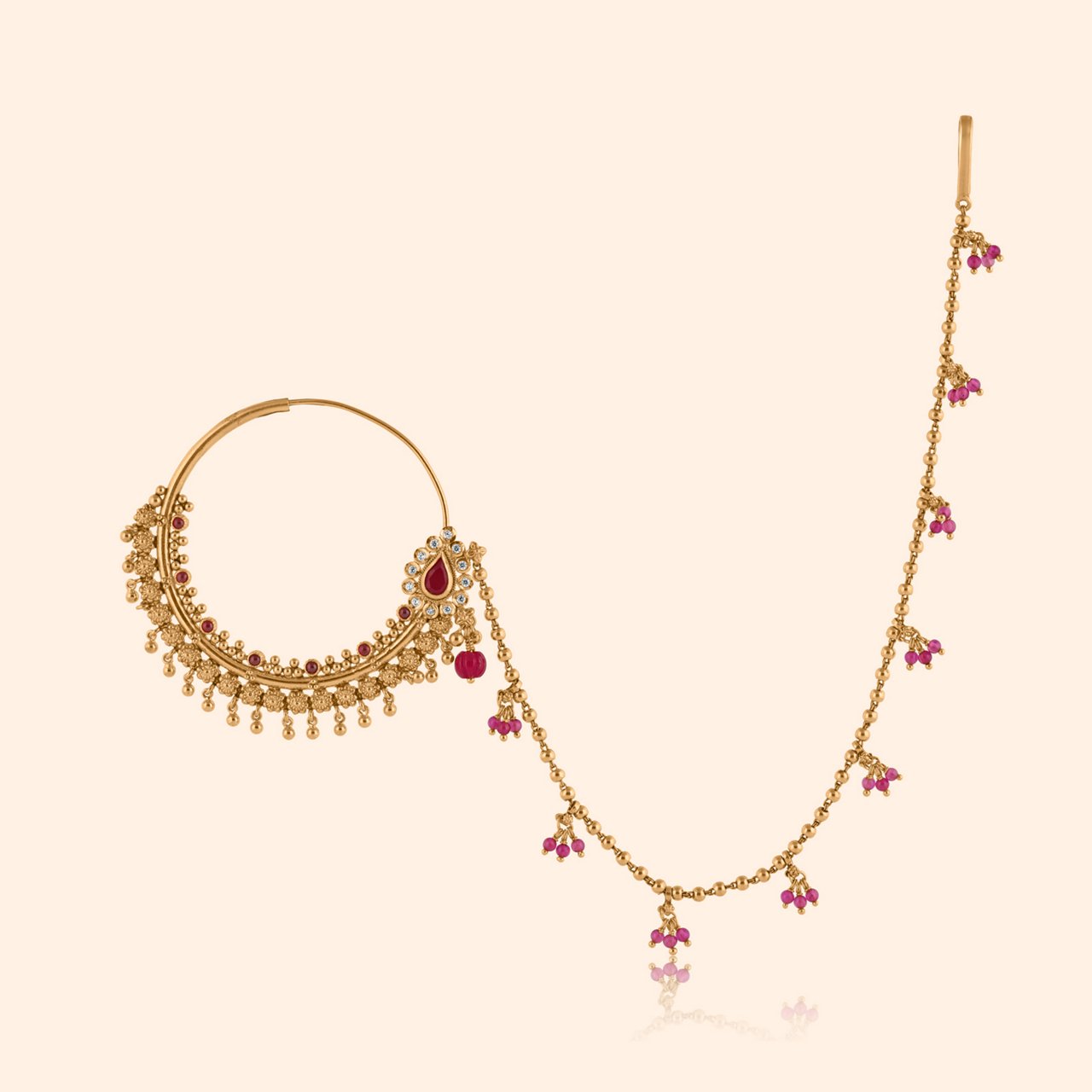 Match with Khwaab Gold Bridal Drop Earrings – 22KT yellow gold drops featuring majestic peacock motifs, thushi balls, and geru antique finish with vibrant gemstones for heritage celebration. Add Chaitali Gold Bangle – 22KT yellow gold with intricate geometry, deep red stones, and warm geru antique texture evoking ceremonial richness. Complete with Vaishnavi Gold Nath – 22KT yellow gold blending floral and geometric motifs for refined ceremonial elegance and bridal sophistication.
