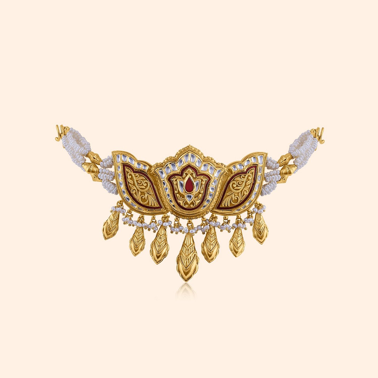 Raasvi celebrates Gujarat’s vibrant colours and celebrations in 22Kt gold across three layers: Chandan Haar with chains echoing historic arches, cascading Jhalar from temple carvings and toran tassels, and Jhumna Haar blending Kalighati artistry with ruby jadai and Pankhi motifs.