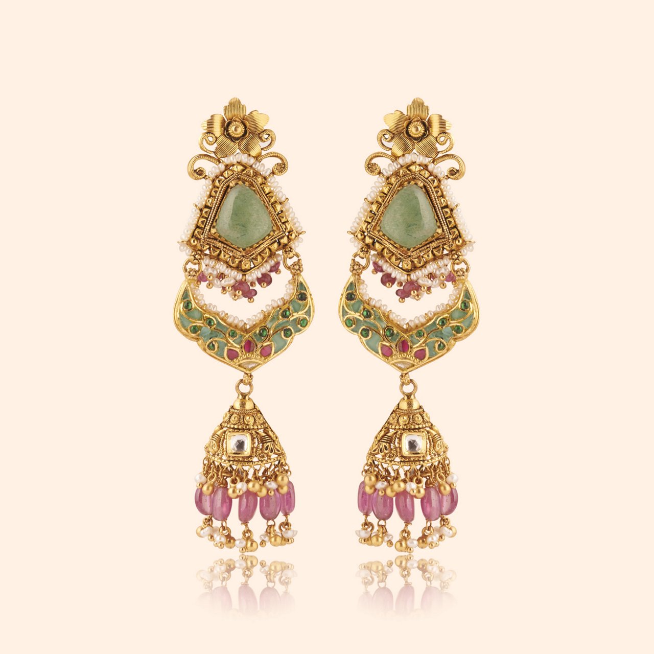 Enhance with Padma Vows Gold Bridal Drop Earrings – 22KT yellow gold drops with delicate Padma motifs, gemstones, swaying jhaalar, and antique finish celebrating tradition and new beginnings.