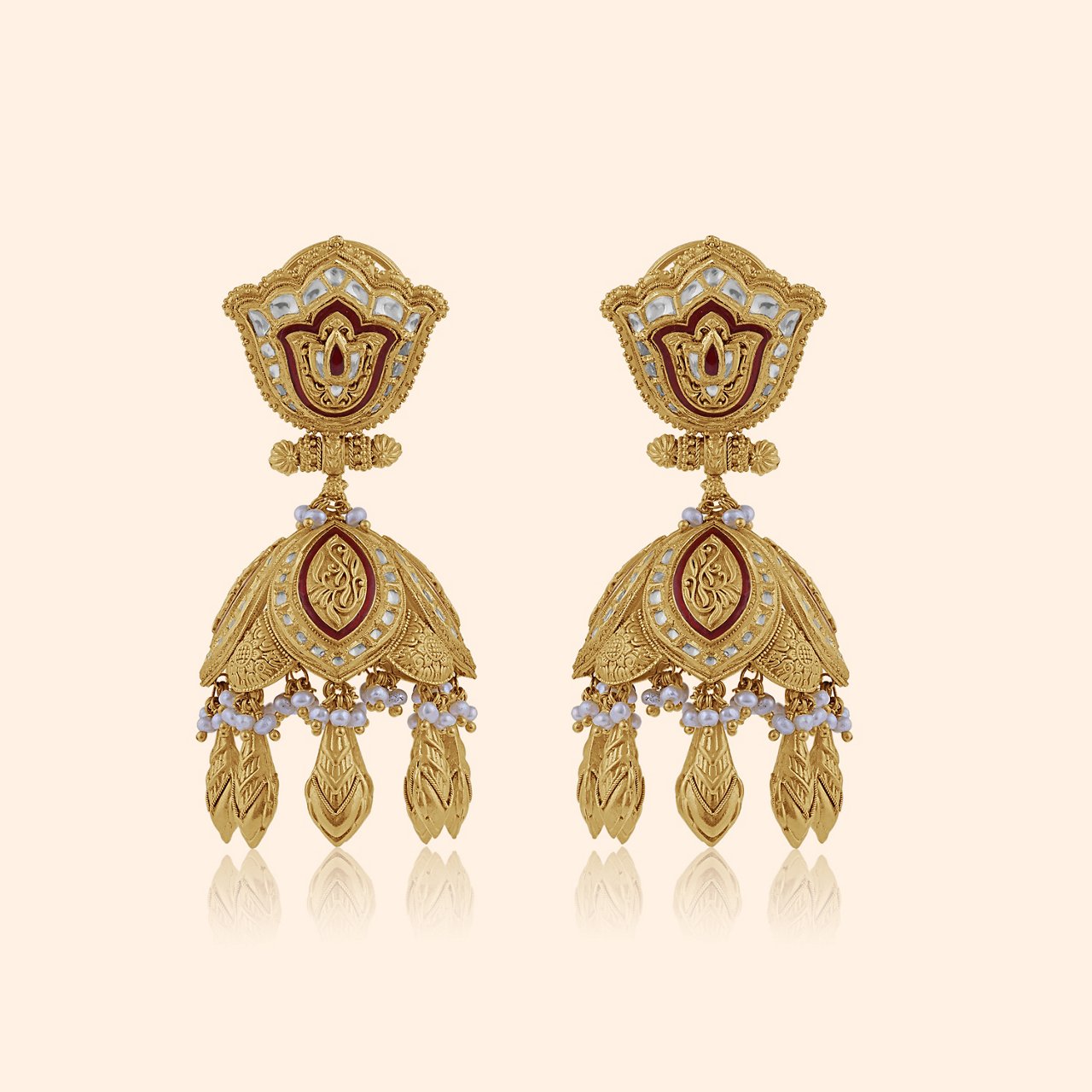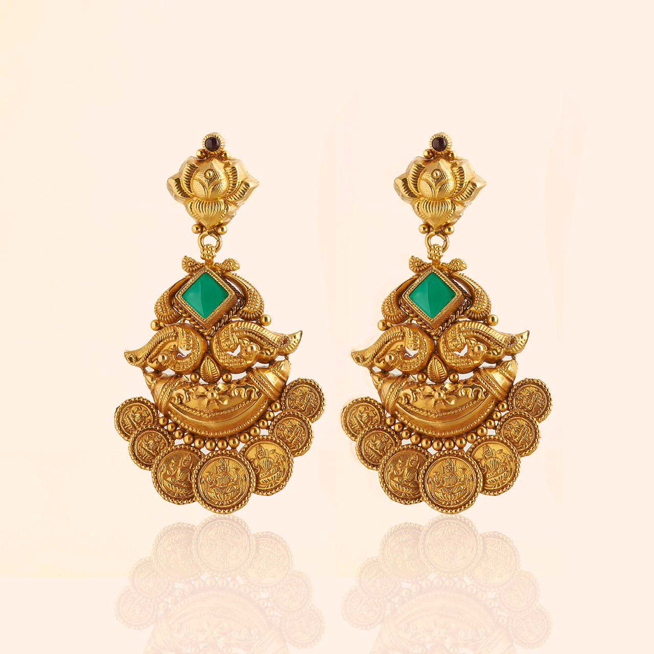 Saptapadma Gold Drop Earrings – Delicate 22Kt yellow gold drops with embossed lotus petals, swaying gracefully to frame the face (perfect with maang tikka).