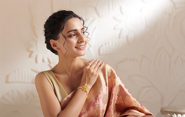 Match with Divya Bandhan Gold Bridal Drop Earrings – 22KT yellow gold drops with antique finish, weaving dodi, peacock, and elephant motifs with coloured gemstones for heirloom grace. Add Samriddhi Gold Bangle – 22KT yellow gold with floral and geometric detailing in antique finish, perfect for grand celebrations. Complete with Raahi Gold Haathphool – 22KT yellow gold blending floral motifs and red accents, telling stories of love’s gentle light.