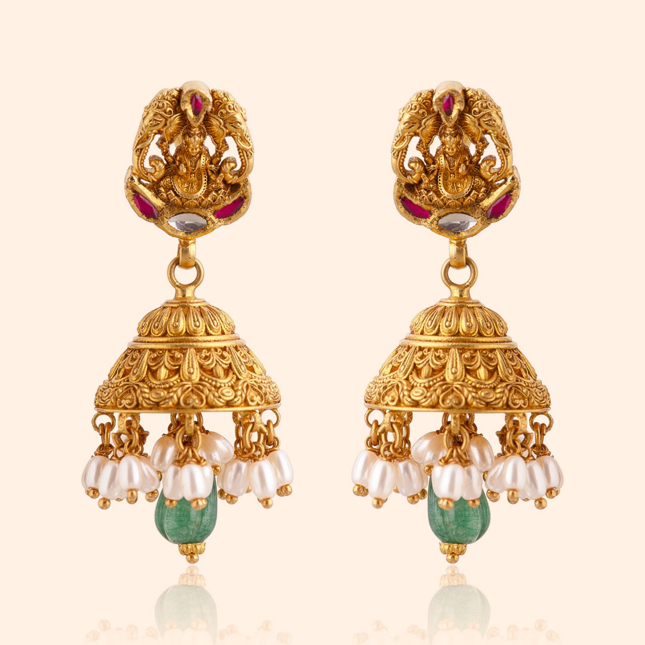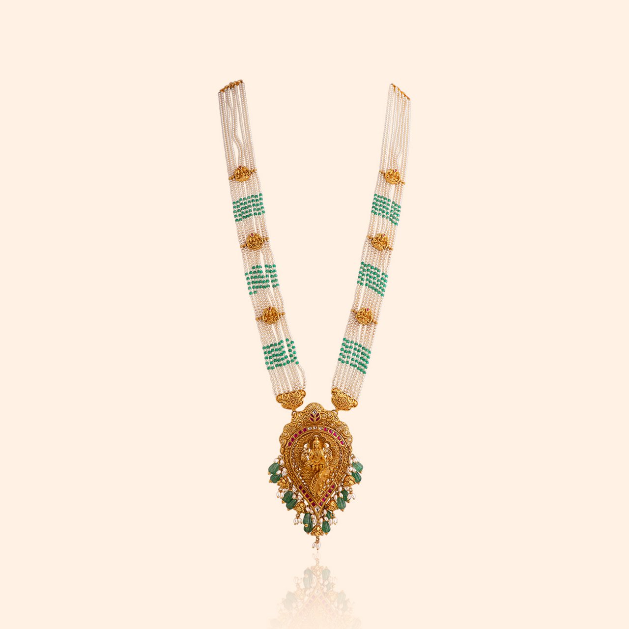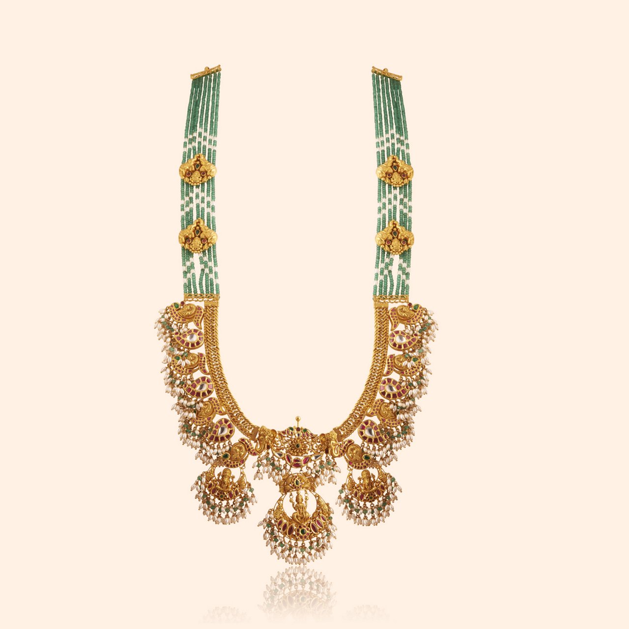 You will feel it in the warmth of Kaasu coins shaped with intricate detailing, in the soft glow of Bottu forms crowned with coral bead flowers, in the delicate green patta work that brings auspicious colour. You will see it in the temple-pillar carvings, the curves of Mango Haar links, the serenity of shankh and Lakshmi pendants, and the joyful rise of elephant and peacock motifs sculpted like blessings in gold.