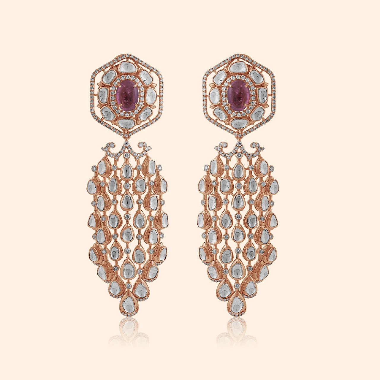 Pastel lehengas such as blush, lavender, or champagne tones find balance in rose gold and Polki accents. The muted gleam of rose gold pairs well with soft hues, while Polki brings heritage depth to modern silhouettes.
