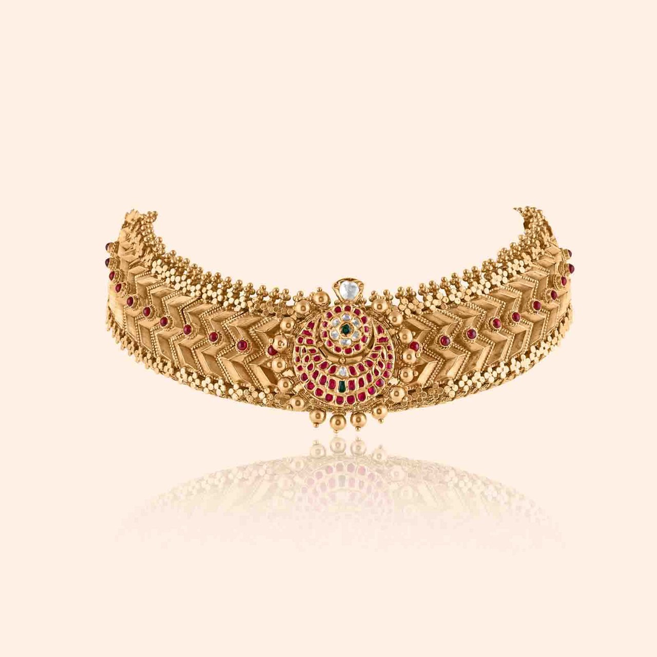 The first layer, the Vajratik Haar, glitters with the iconic Chandrakor Tilak and the rhythmic gleam of Vajratik coins. Each contour recounts countless tales of valour and pride, sculpted with the timeless finesse of Shindeshahi artistry.
