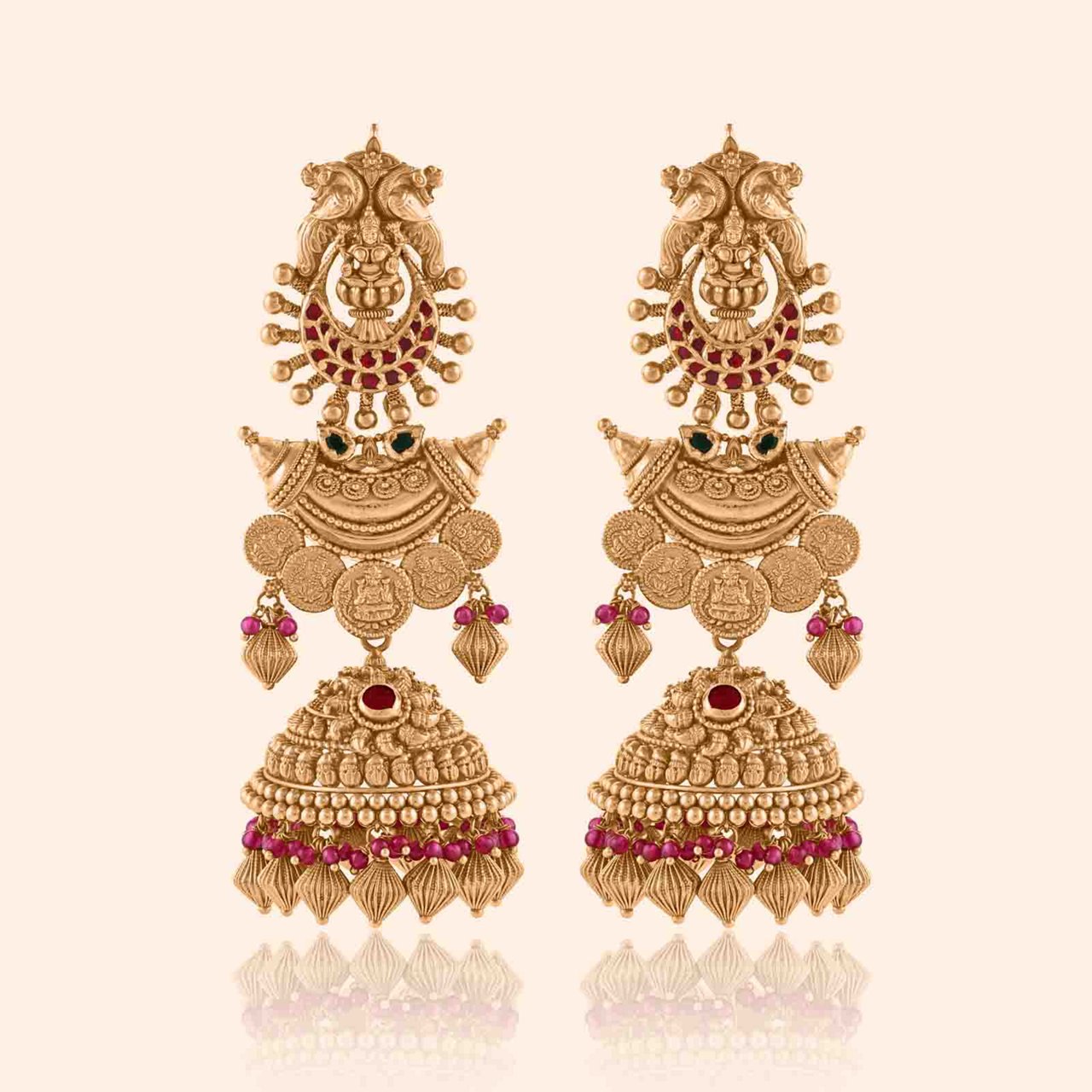 Feel the spirit of Rajashree in the radiance of Surya Pulti motifs, the bloom of kamal-inspired garlands, and the auspicious glimmer of green stones resting close to your heart. Pair the earrings with a nauvari, as you step into your Sakharpuda ceremony- their luminous glow framing your smile.
