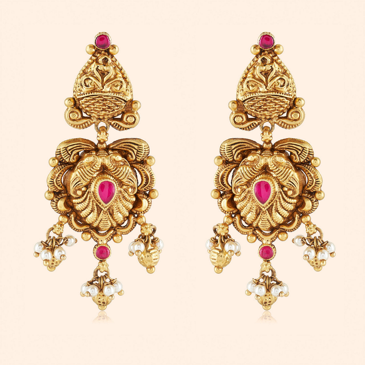 Divine forms emerge from sacred artistry deep, promises of protection ancient goldsmiths keep, while the weary world does sleep. This necklace is imbued with the spirit of traditional temple jewellery, radiating timeless devotion and intricate craftsmanship. It features a series of carved motifs along its length—depicting deities, auspicious symbols, or elaborate floral patterns—all enhanced with a rich antique finish that adds depth and character. Tiny ruby accents may be placed for colour, and the design leads to an ornate central pendant echoing the divine theme, crafted with reverence in pure 22 karat yellow gold.