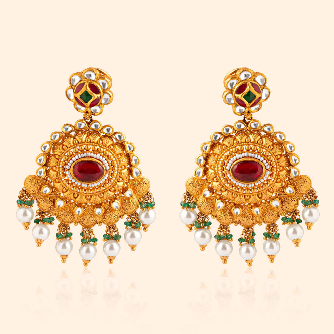 A harmonious blend of floral and geometric designs, this 22KT yellow gold necklet stands as a true statement of elegance. Its detachable feature offers versatile styling options, making it perfect for heavy occasion wear. The rich, standard antique finish is complemented by the vibrancy of glass kundan and stones in pink, green, and pearl hues, bringing together a timeless charm with a modern twist. This jewel evokes an aura of sophistication, elevating any traditional ensemble with its intricate beauty and craftsmanship.