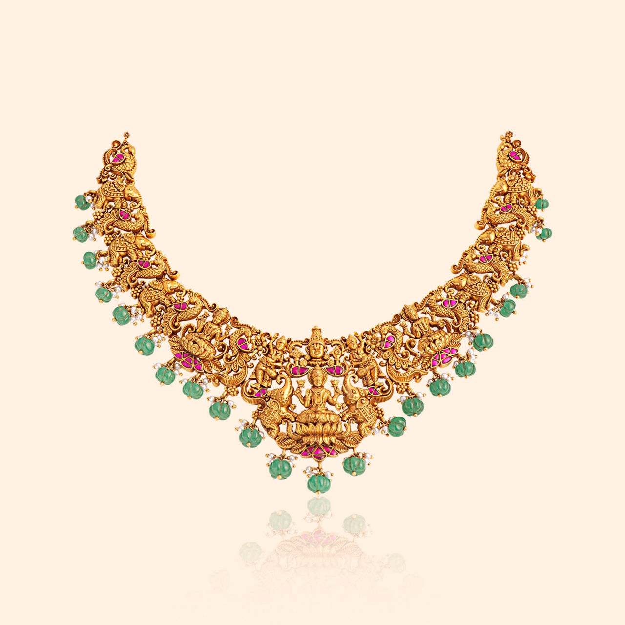 Steeped in tradition and sacred artistry, these 22KT gold drop earrings honour the divine with motifs of Goddess Lakshmi, Balaji, and the majestic elephant. Designed for grand occasions, their intricate craftsmanship is accentuated by the rich hues of precious rubies, emeralds, and pearls. Every detail, from the sculpted deities to the embellishments, evokes a sense of reverence and opulence, making them an heirloom-worthy treasure. Whether worn for sacred ceremonies or momentous celebrations, these earrings illuminate your presence with a celestial glow.