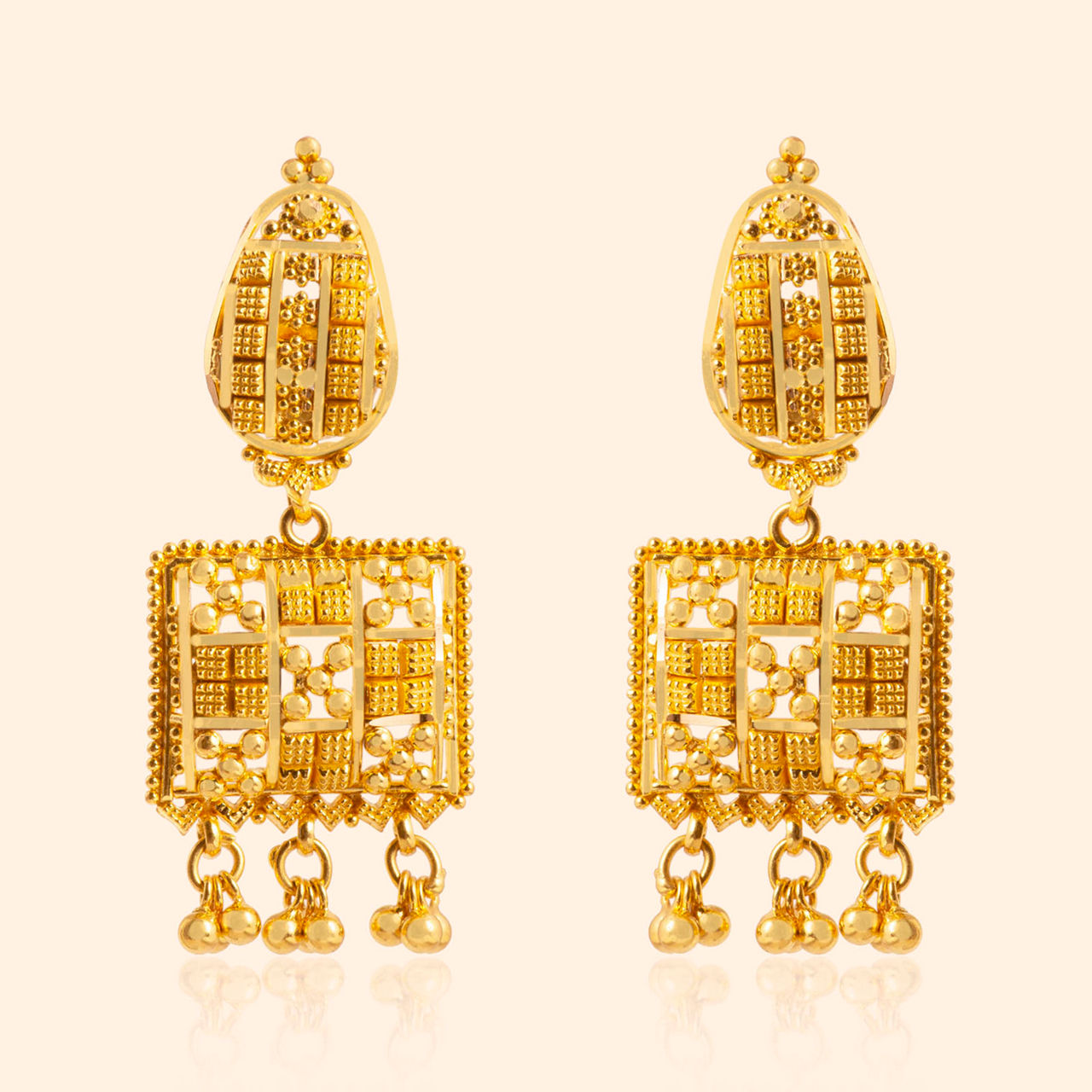 This 22k Gold, yellow gold short neckwear features a striking geometric design, making it a perfect addition to your heavy occasion wear collection. Its bold yet refined elegance embodies elevated traditional craftsmanship, offering a sophisticated touch to any ensemble, and effortlessly enhancing your radiant presence.