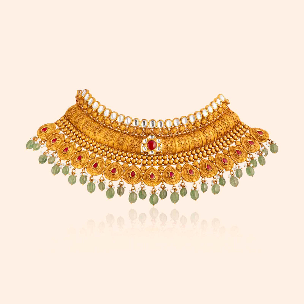 Regal blossoms cascade like heritage drops of old, stories of queens and ancient kingdoms to be told, more precious far than simple gold. These earrings are a magnificent example of elevated traditional design, crafted for heavy occasion wear. They feature a multi-layered construction, showcasing intricate floral motifs accented with vibrant gemstones. The gold work is exceptional, with detailed stamping, carving, or textural techniques. The design culminates in a cluster of dangling stone drops—perhaps lustrous pearls or serene green aventurine beads—adding graceful sway, superbly crafted in rich 22 karat yellow gold.