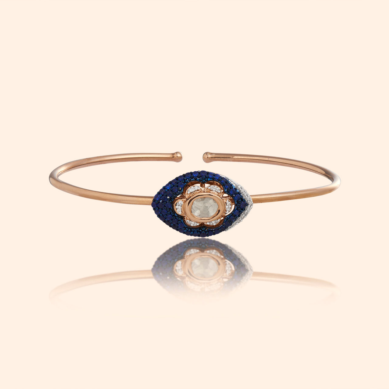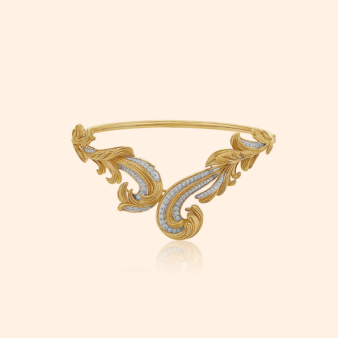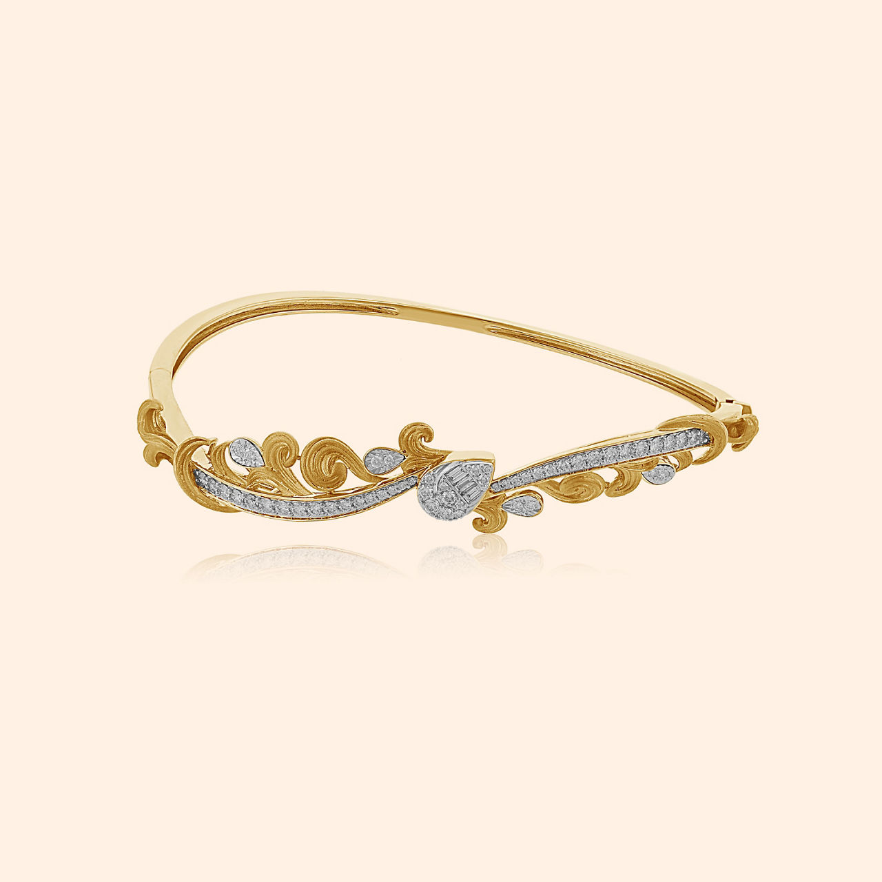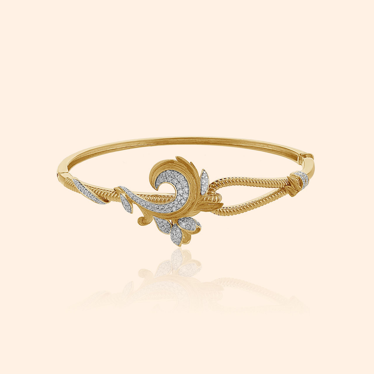 As you trace the intricate kaarigari of this studded bangle, you will feel like you are wandering through a magical forest of light, dancing with the fireflies, glowing at night. Masterfully crafted in 18 karat gold, and studded with mother of pearl and beautiful green stones, the intricate floral motifs glow with a high sheen and matte finish. This elegant bangle is a timeless classic that you can love and flaunt forever.