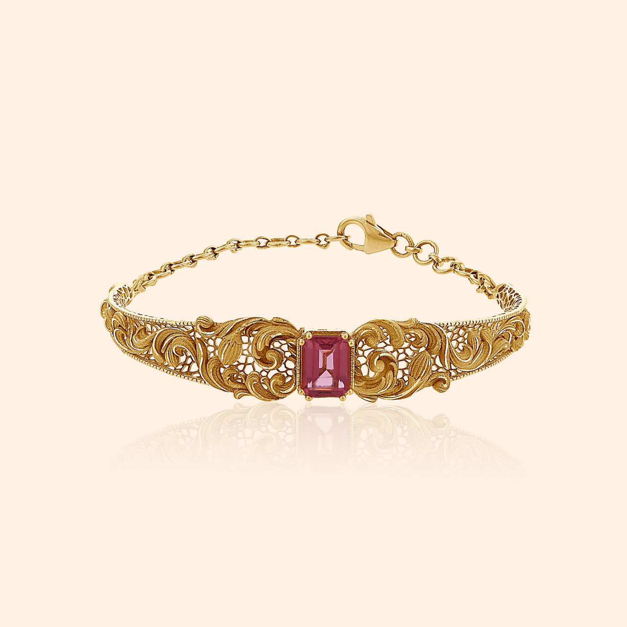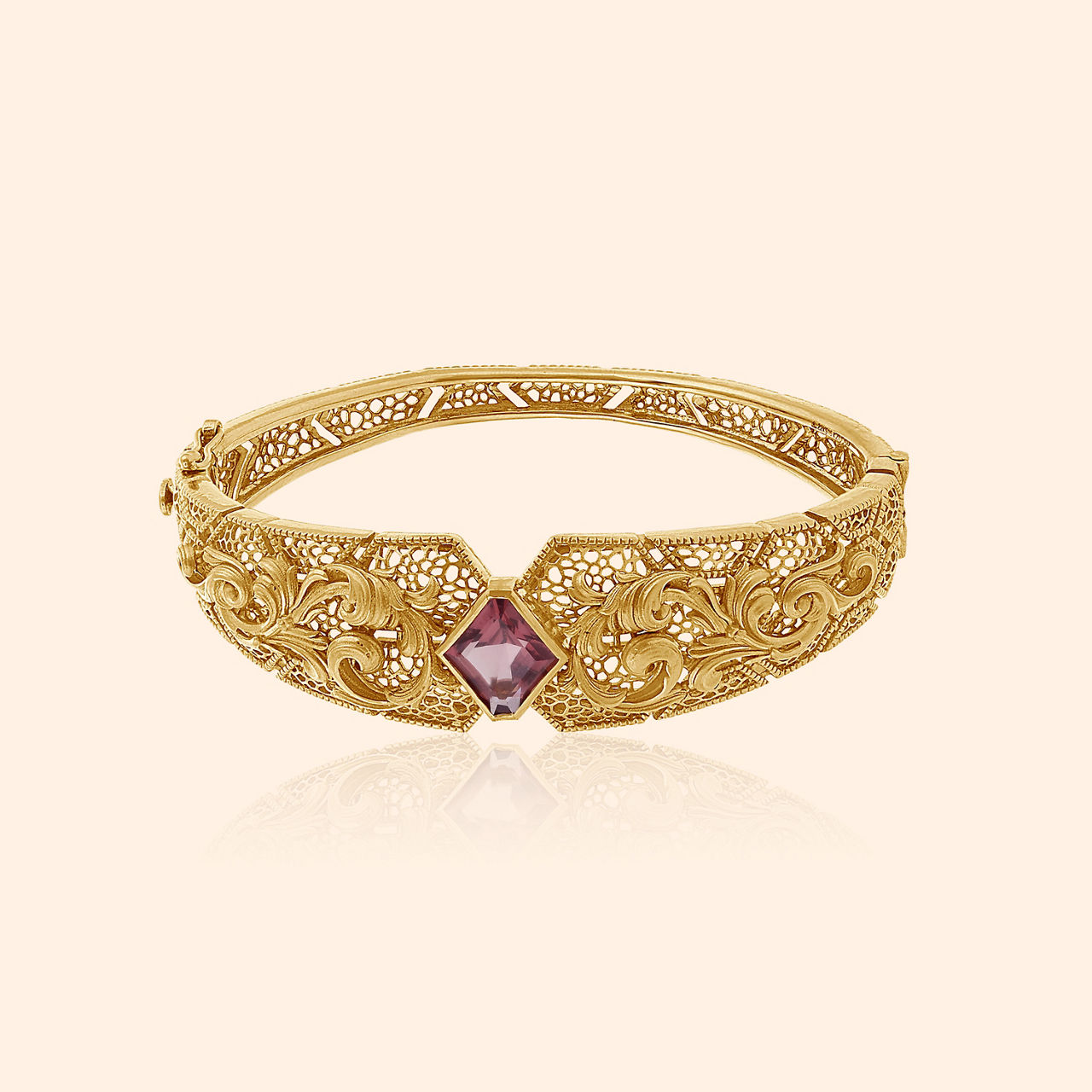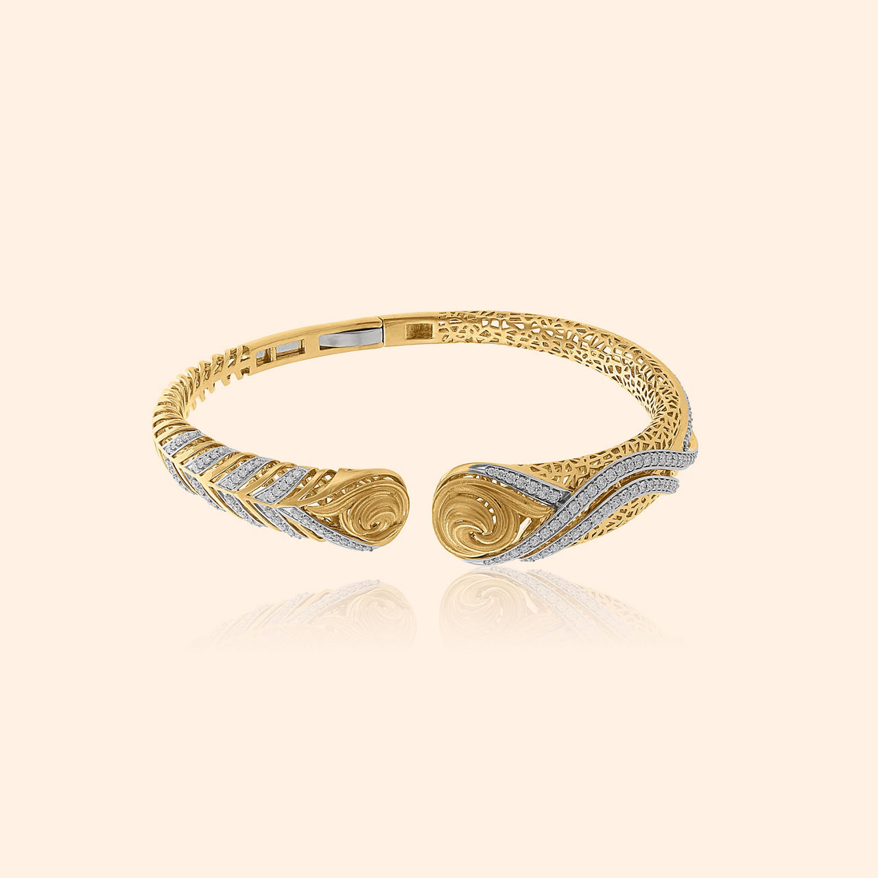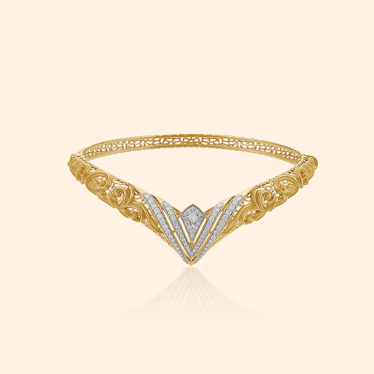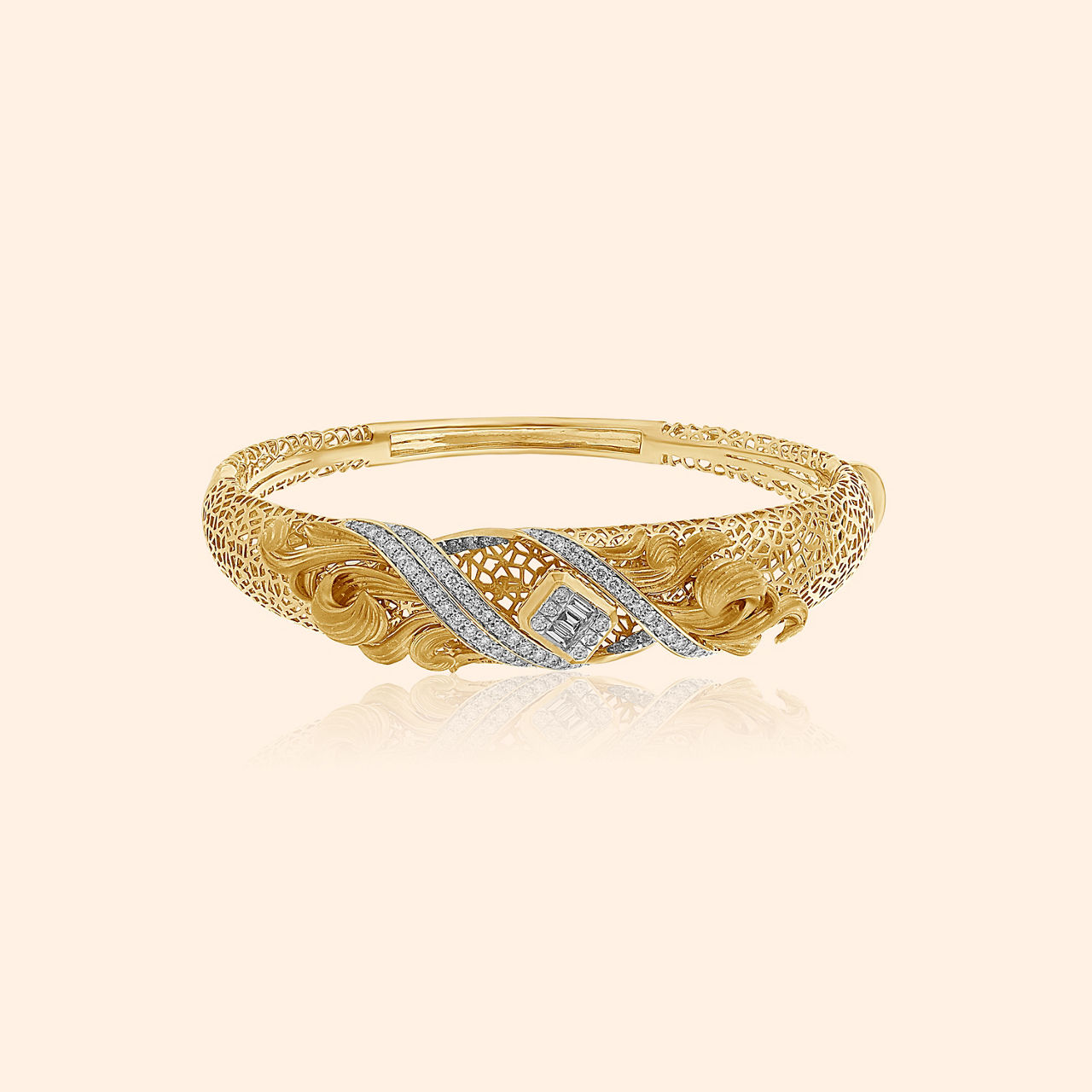 As you trace the intricate kaarigari of this studded bangle, you will feel like you are wandering through a magical forest of light, dancing with the fireflies, glowing at night. Masterfully crafted in 18 karat gold, and studded with mother of pearl and beautiful green stones, the intricate floral motifs glow with a high sheen and matte finish. This elegant bangle is a timeless classic that you can love and flaunt forever.
