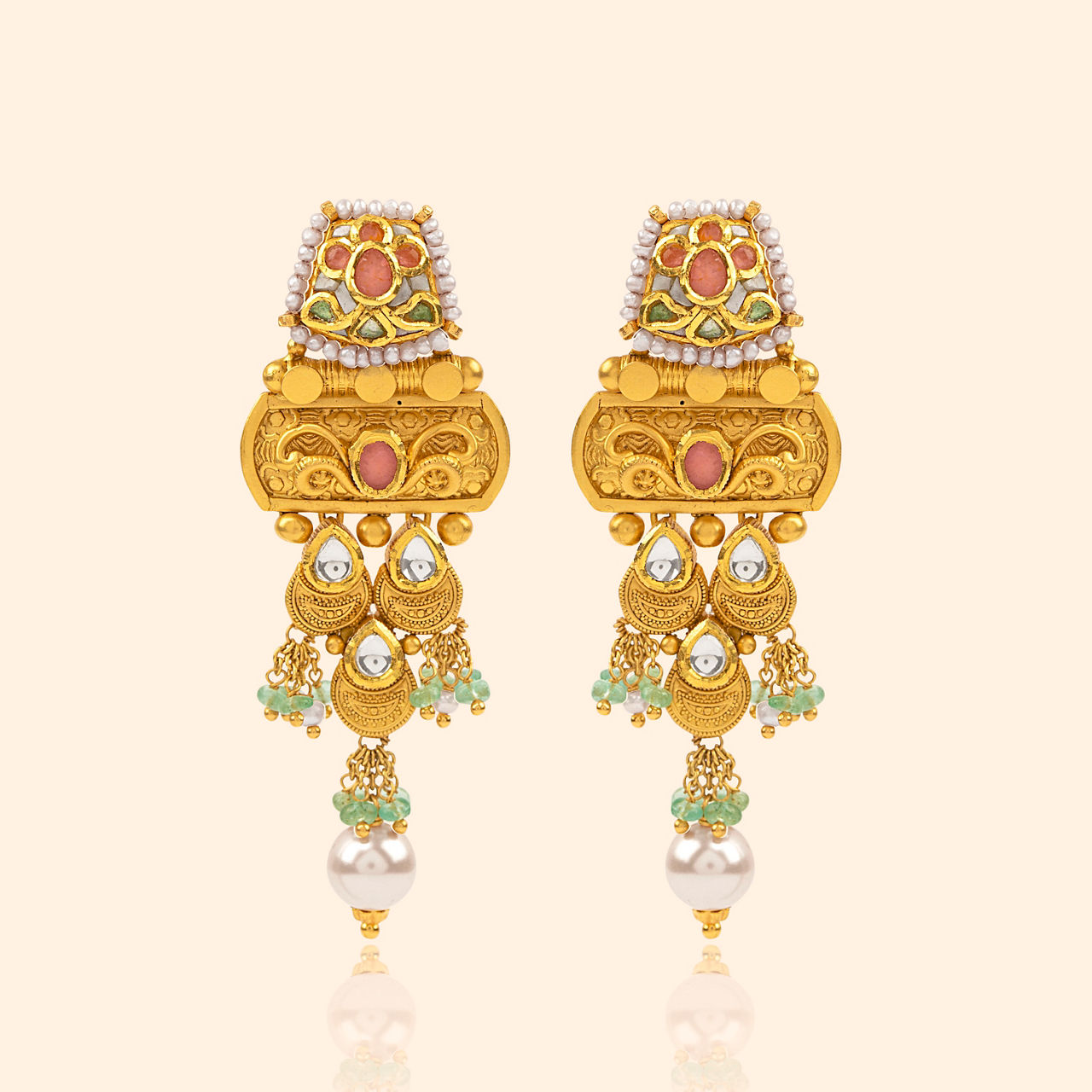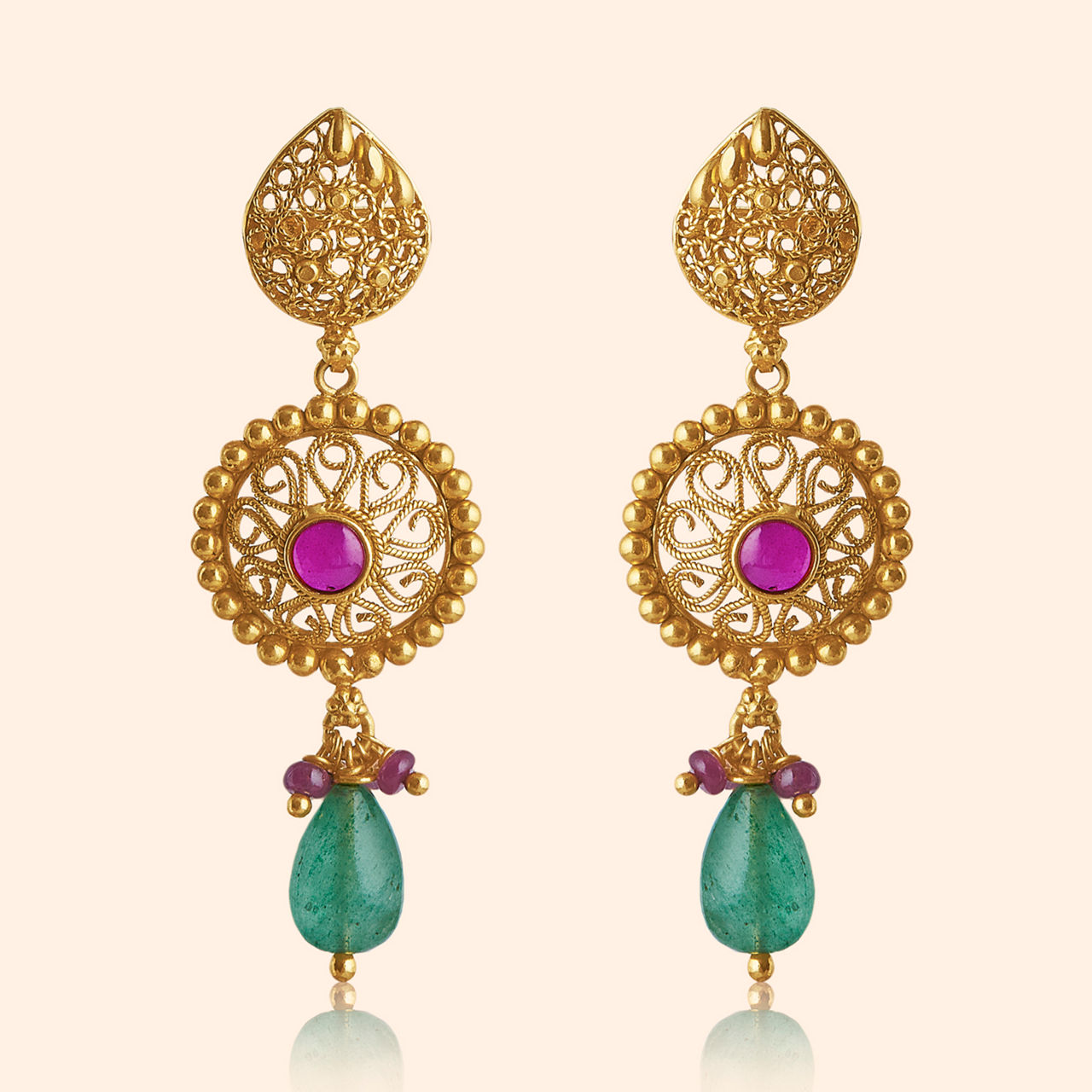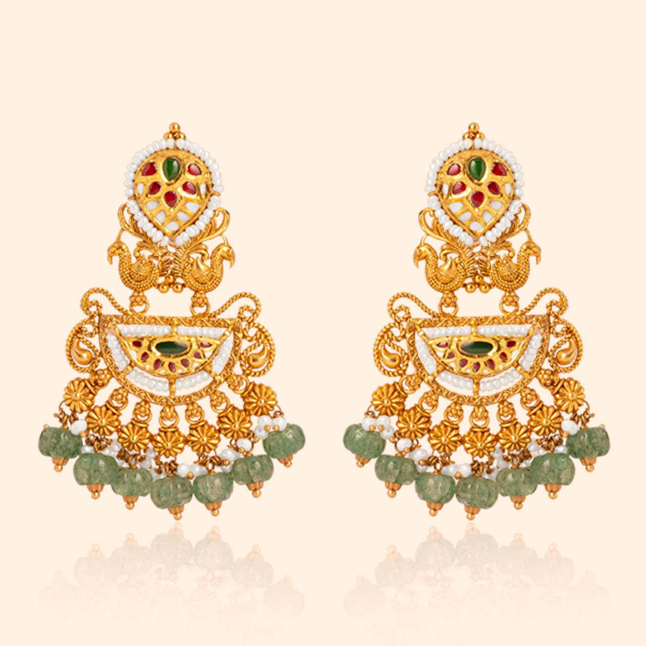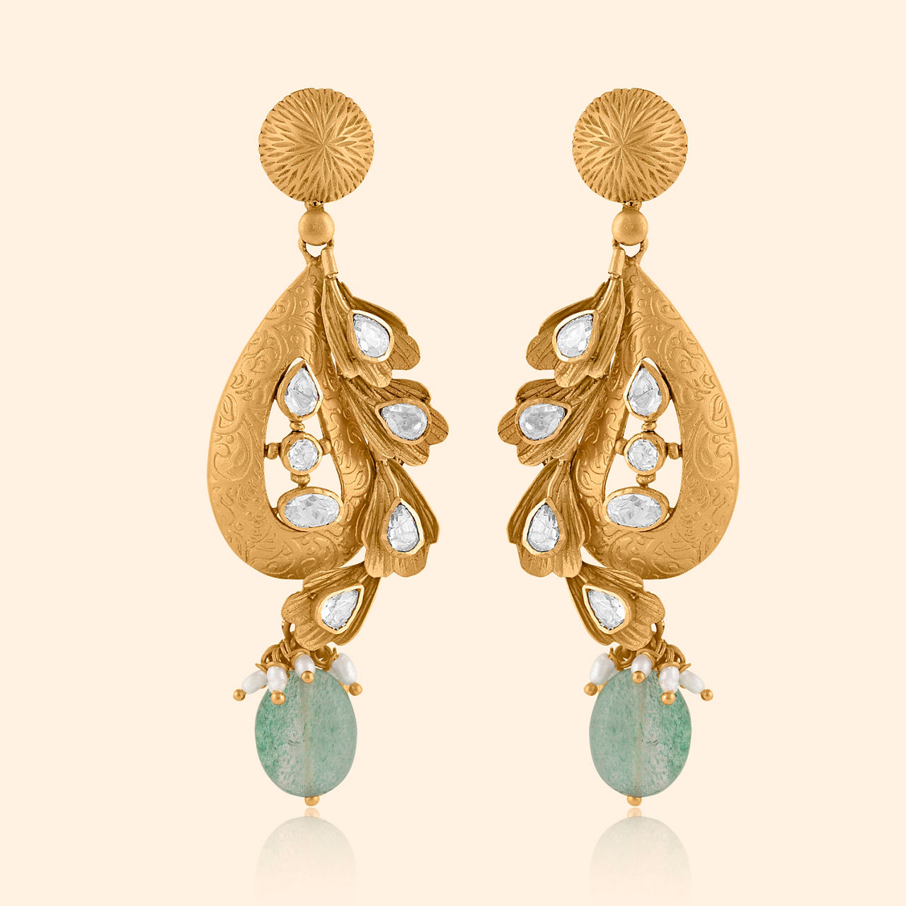 Delicately crafted in 18 karat gold in matte and high shine finish, with elegant Mother of Pearl detailing, these earrings glow on your ears like the light of the enchanted forest. Intricate floral motifs embellished with beautiful green stones bring the bounty of the trees close to you. With a modular detachable drop they can be light and dressy- however you want to wear them!