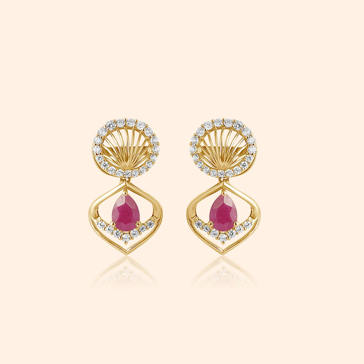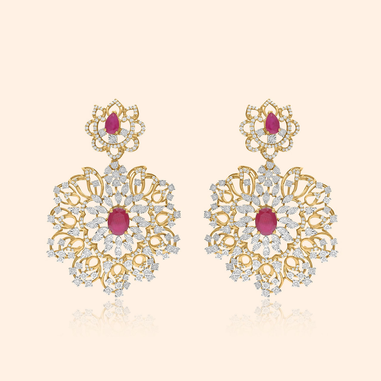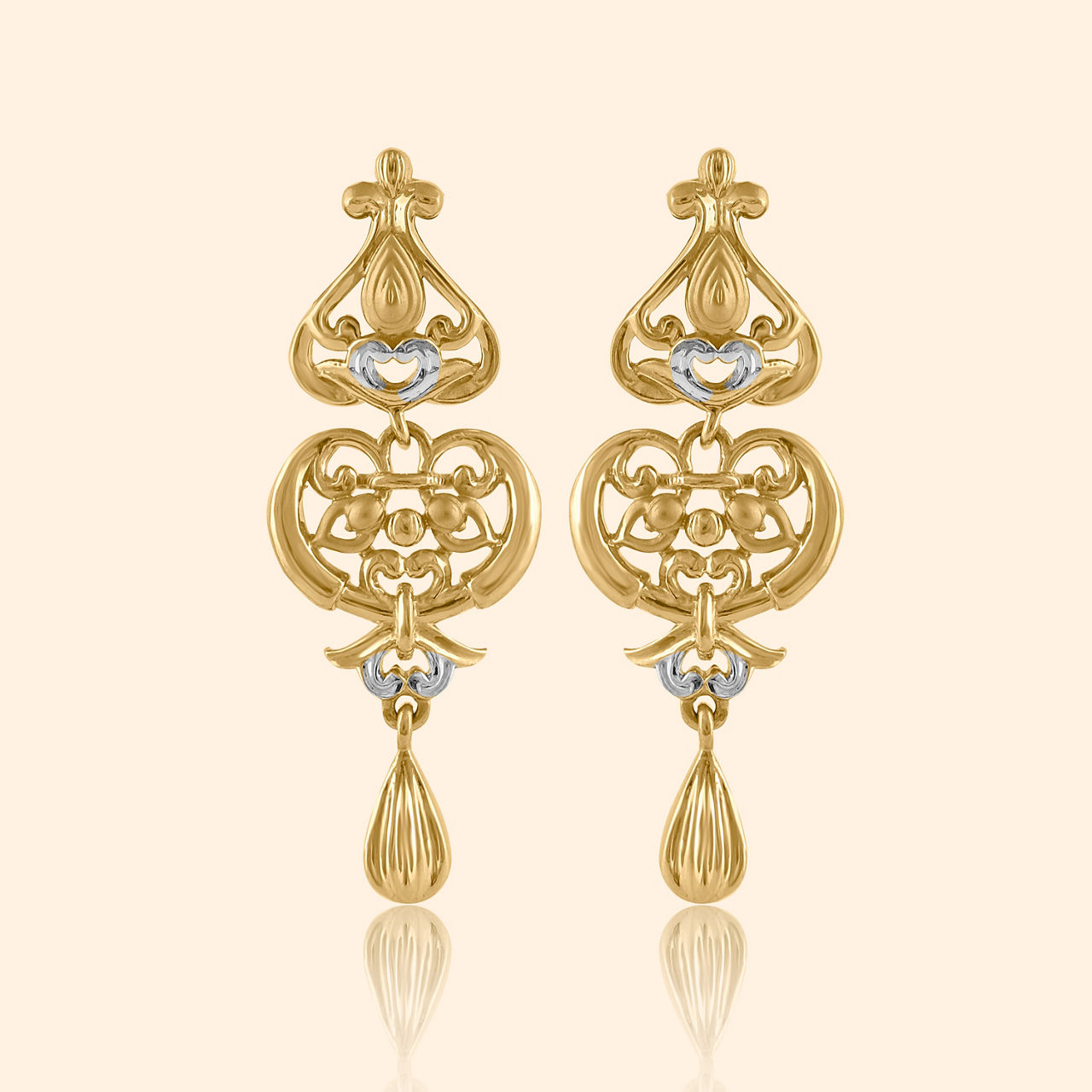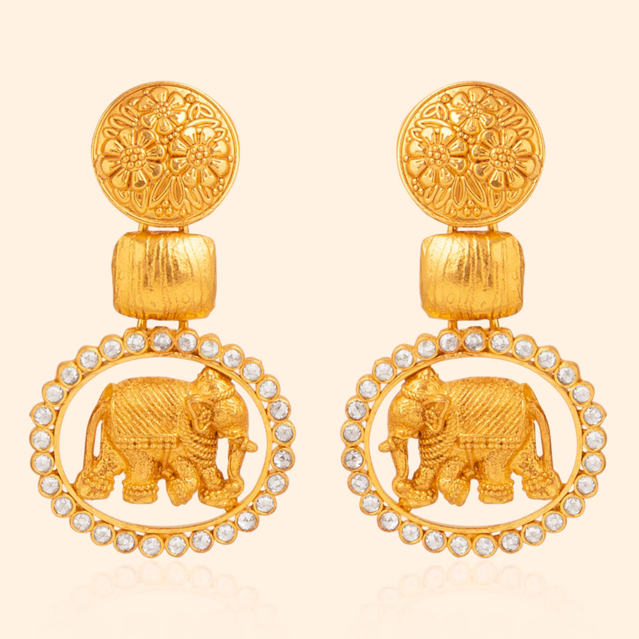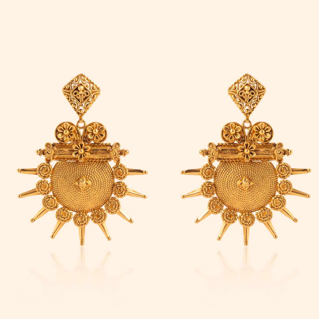 Delicately crafted in 18 karat gold in matte and high shine finish, with elegant Mother of Pearl detailing, these earrings glow on your ears like the light of the enchanted forest. Intricate floral motifs embellished with beautiful green stones bring the bounty of the trees close to you. With a modular detachable drop they can be light and dressy- however you want to wear them!
