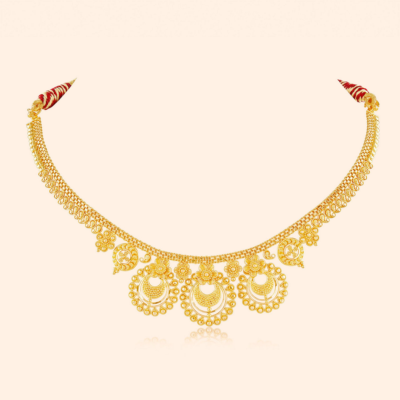 Majestic arches curve like palace gates of old, telling tales of queens in shimmering gold. These grand chandbali-style earrings begin with a floral stud and lead to an ornate crescent drop adorned with granulation, beadwork, and dangling gold spheres. Their swirling lower motifs add movement, evoking regal splendour. Crafted in resplendent 22 karat yellow gold, they’re perfect for grand occasions.
