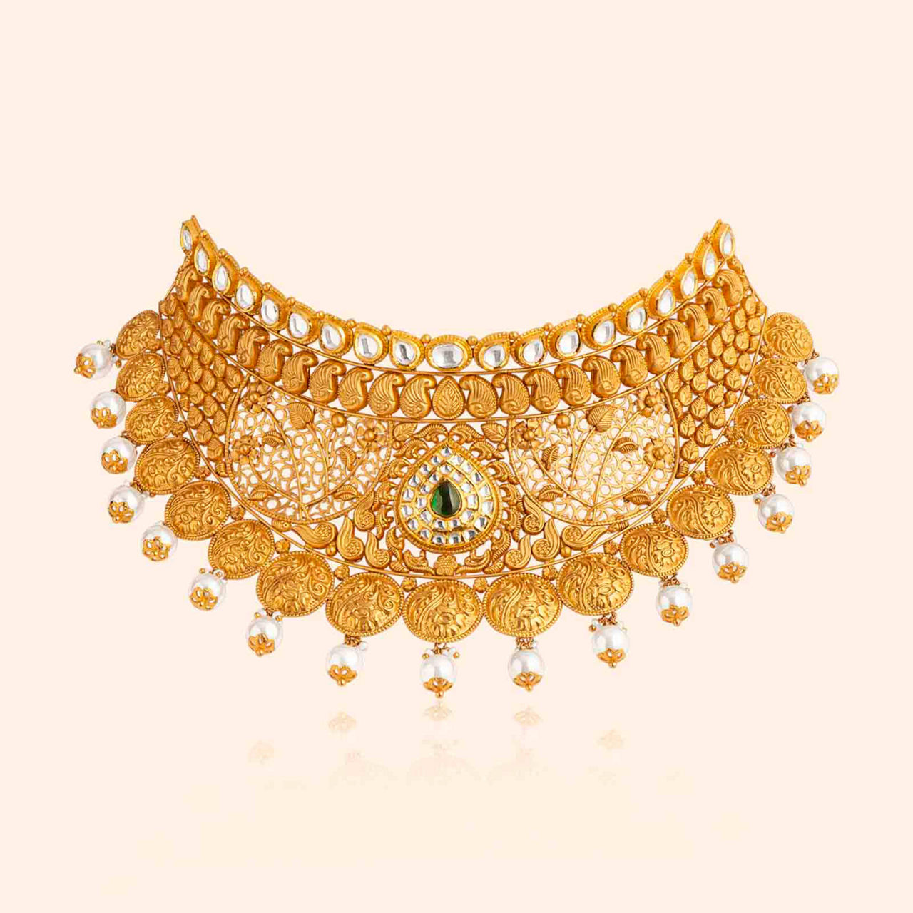 Peacocks dance on bells of golden sound, with emerald tear where beauty can be found, blessings all around. These jhumka gold earrings are a stunning traditional piece, featuring teardrop studs set with deep green stones and white accents, leading to ornate bell-shaped jhumkas embossed with graceful peacock motifs and finished with a fringe of delicate pearls. These earrings embody festive grandeur and cultural symbolism, perfect for weddings and celebrations. They are exquisitely crafted in lustrous 22 karat yellow gold.