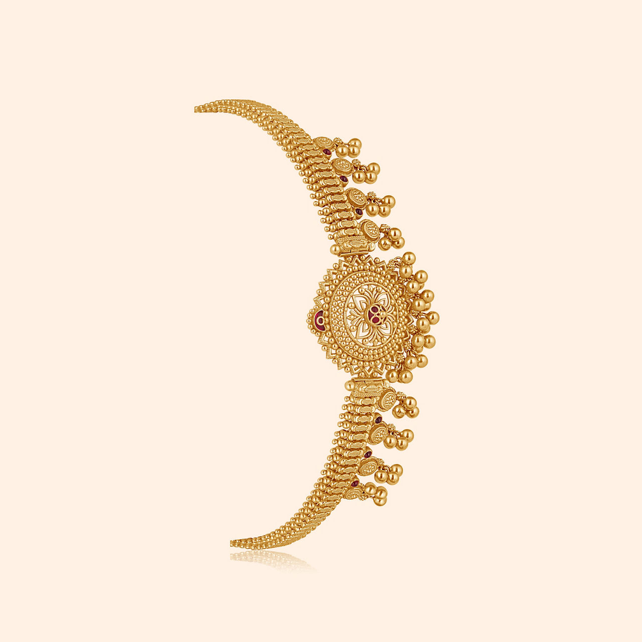 An armlet that weaves elegance into every gesture, Kairvisha is a masterjewel of bridal beauty. Crafted in 18KT yellow gold, this stunning jewel features a blend of brilliant-cut diamonds and semi-precious emeralds, set against a high finish that exudes timeless charm. The abstract design brings a contemporary flair to a traditional accessory, while the radiant emeralds add a rich pop of green, symbolizing prosperity and new beginnings. Perfect for bridal wear, this armlet elevates any wedding ensemble with its captivating allure and intricate artistry, making it a symbol of both modern richness and ancient heritage.