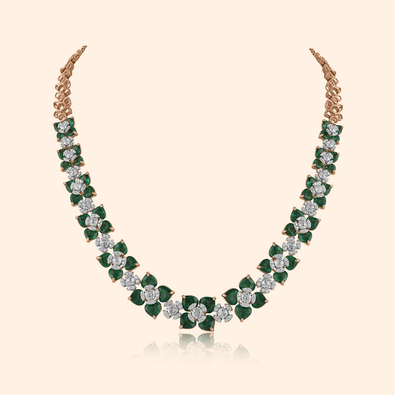 These 18KT pink gold drop earrings effortlessly capture the beauty of nature through their floral design, while the brilliant-cut diamonds and green stones add a touch of vibrant elegance. Perfect for heavy occasion wear, these earrings balance modern sophistication with timeless charm. The high finish enhances their refined appearance, making them a statement jewel that draws the eye with grace and brilliance. Ideal for the woman who seeks to stand out with style, these earrings add a fresh yet timeless element to any ensemble.