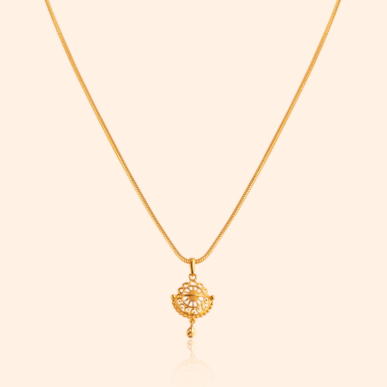 Filigree fans spread wide in golden half-moon light, where two-toned accents make the design bright, dangling teardrops that catch the eye just right. These earrings feature an elegant semi-circular stud design, adorned with intricate filigree swirls and contrasting rhodium highlights within an openwork frame. A polished teardrop dangles below, adding graceful movement. These studs offer a beautiful fusion of modern shape and traditional craftsmanship, ideal for daily wear essentials. Crafted expertly in 22 karat yellow gold, they bring sophisticated artistry to your everyday style.
