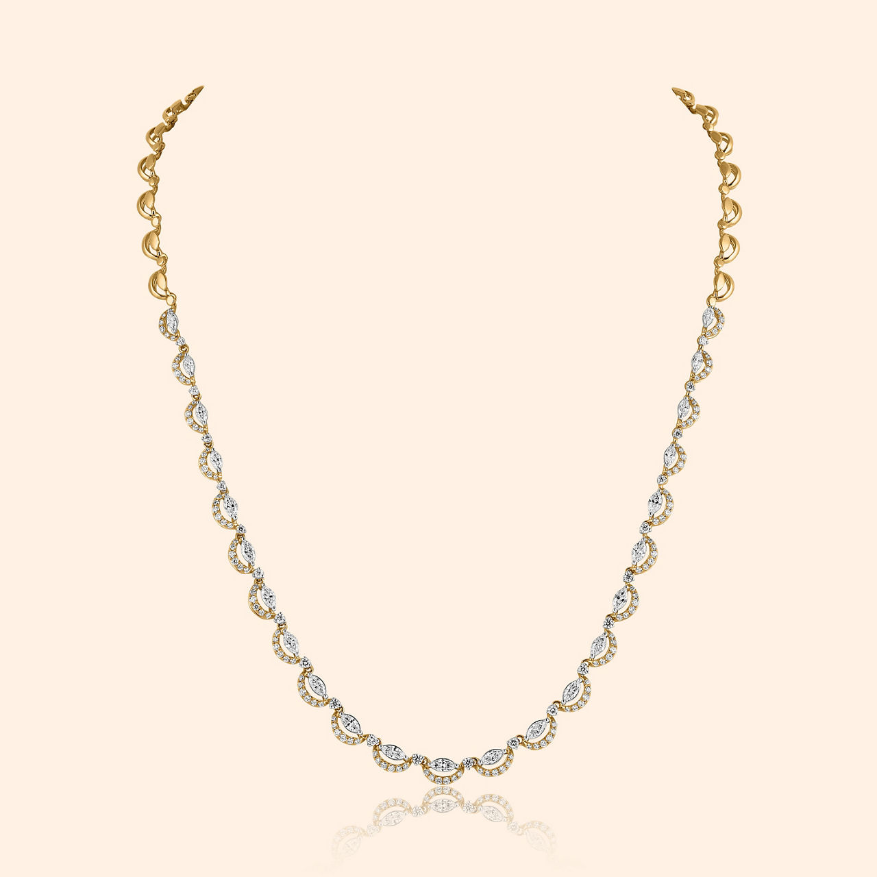 These 18 karat yellow gold diamond drop earrings are a statement of grace and sophistication. Designed with scalloped contours, they blend modern aesthetics with a classic allure. The brilliant-cut diamonds, set meticulously in high polish gold, catch the light with every movement, adding an exquisite touch to any outfit. Perfect for heavy occasion wear, they elevate your look with their intricate design and flawless craftsmanship.