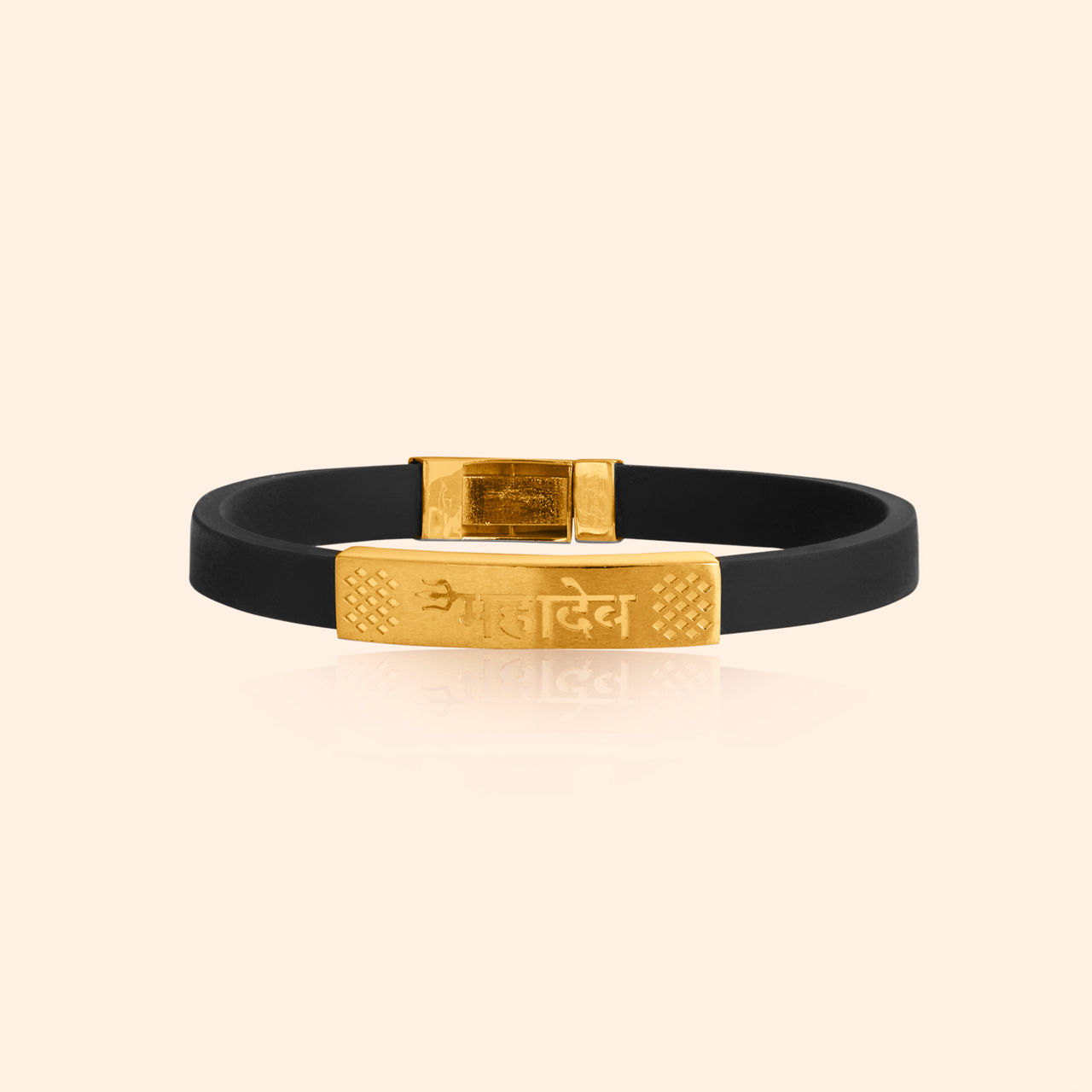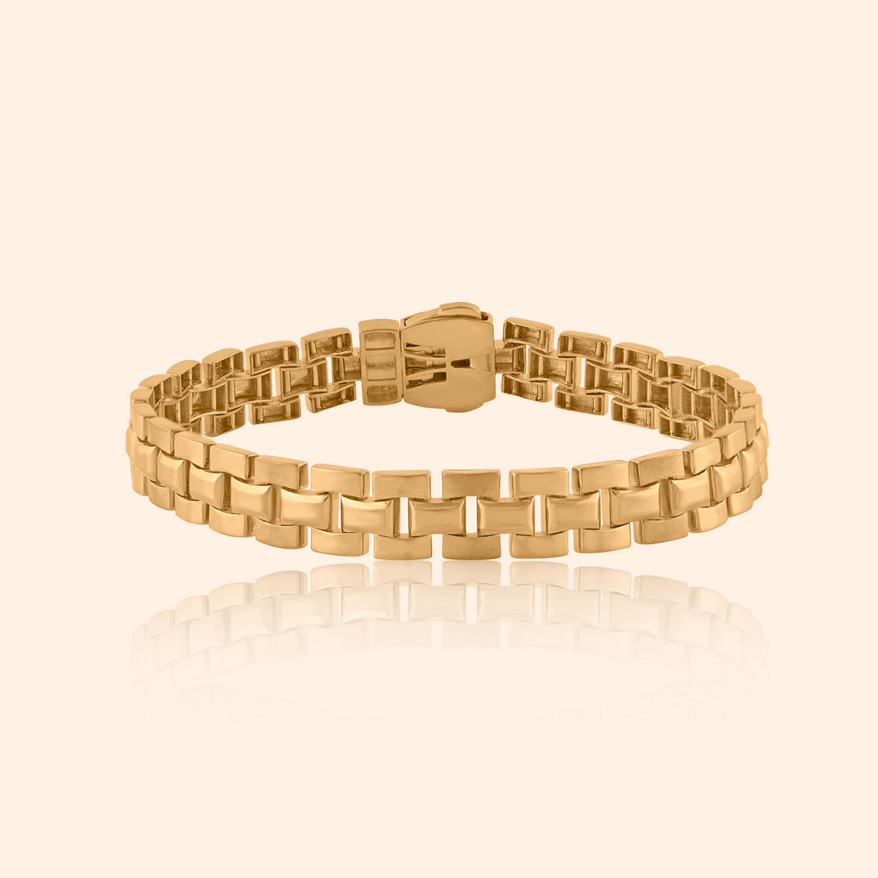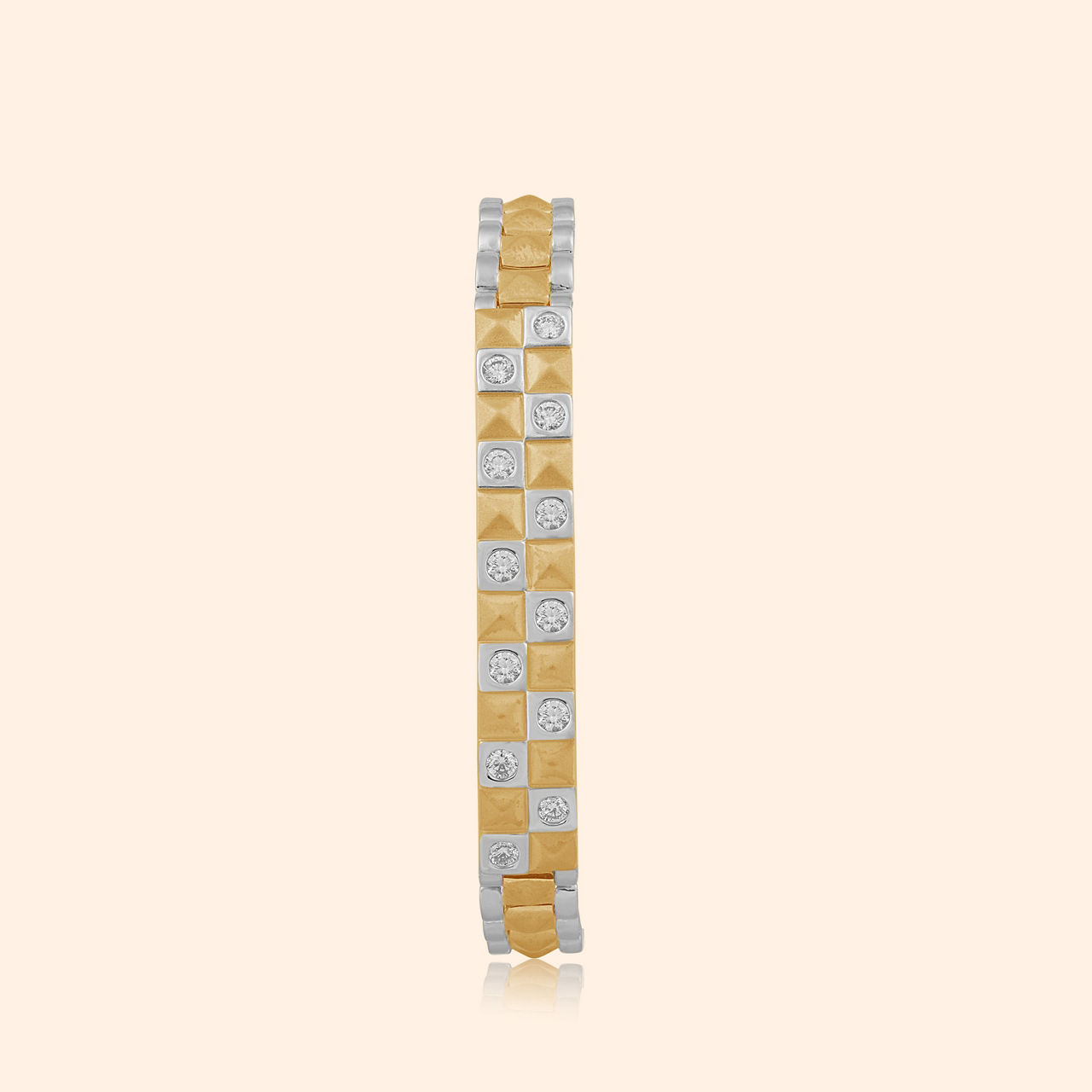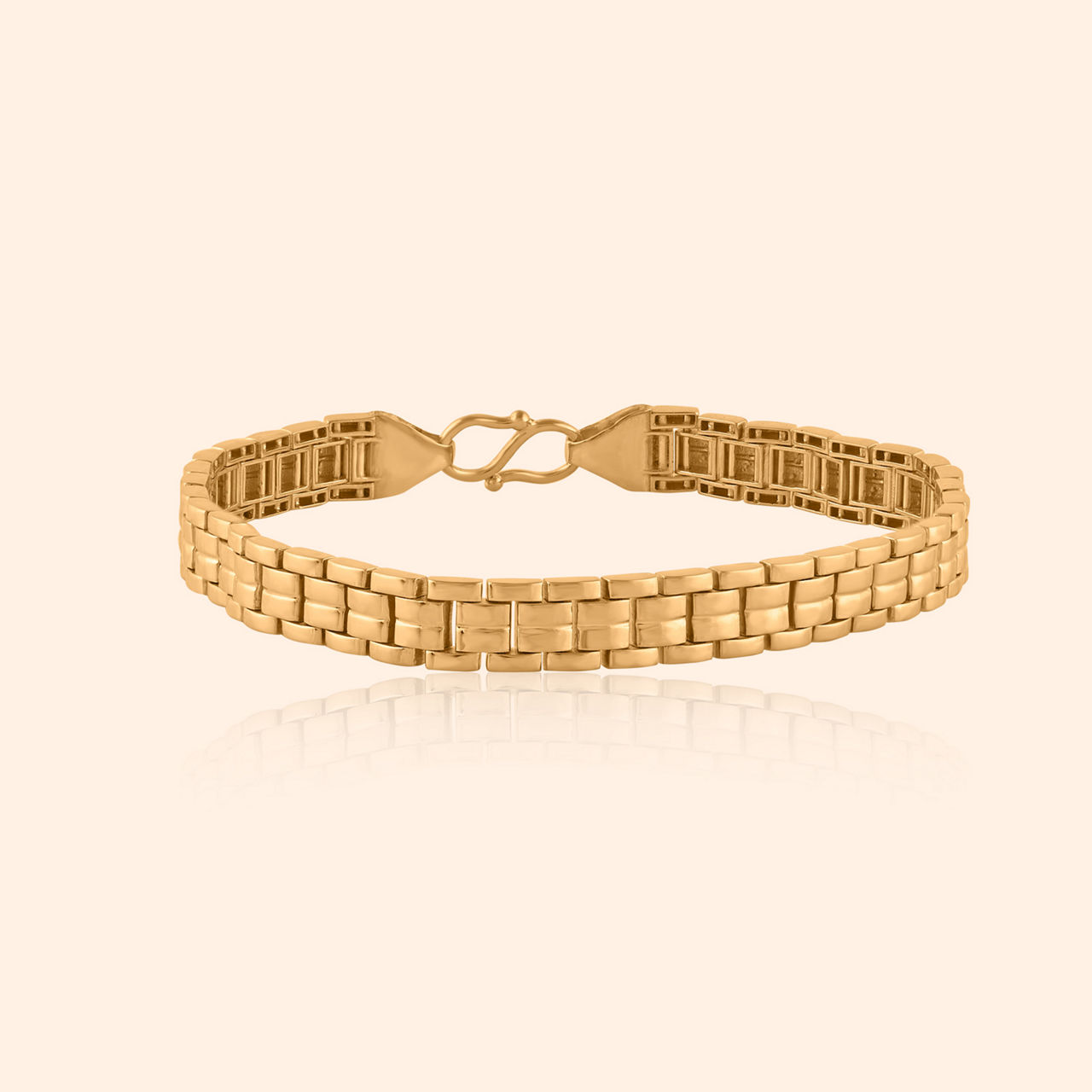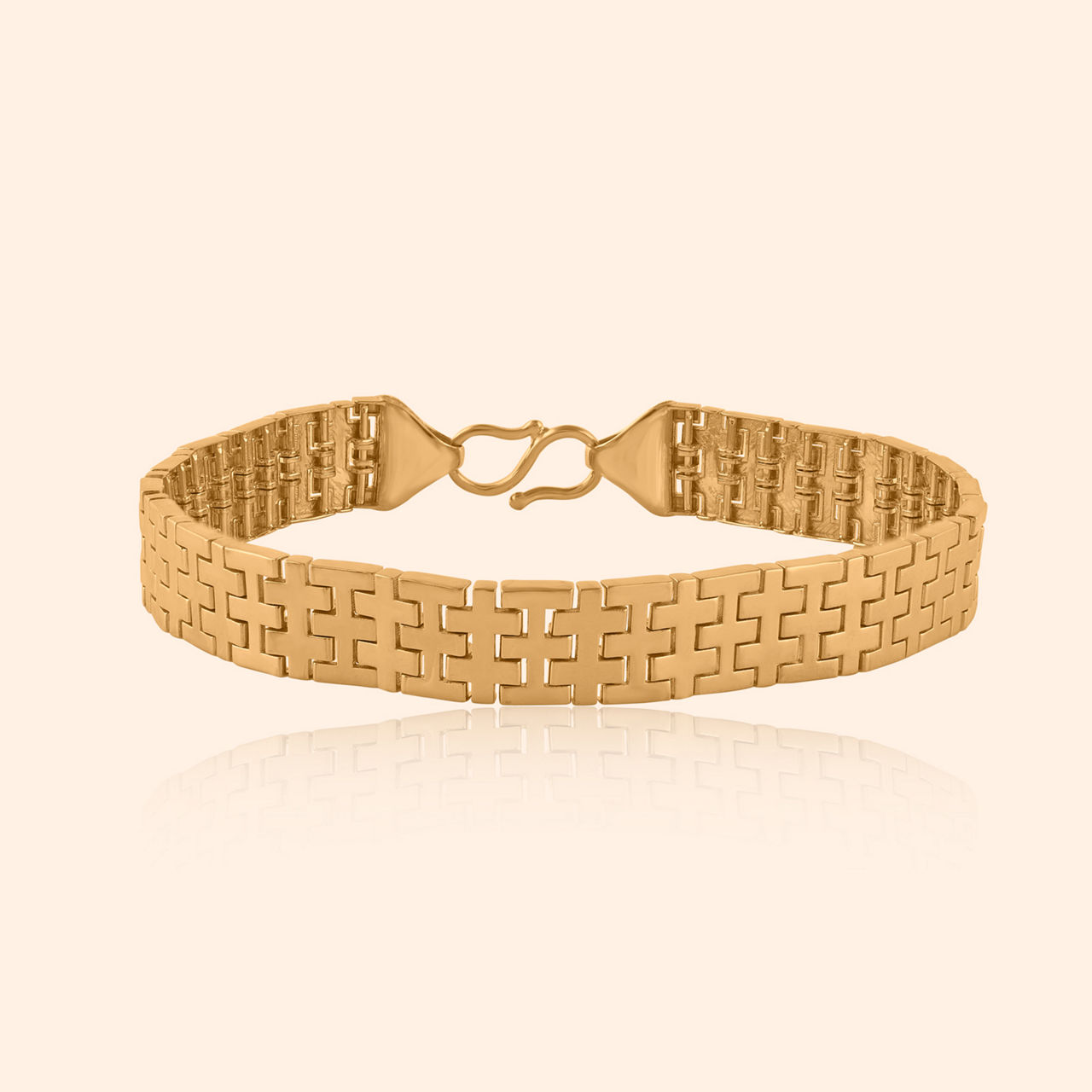 Modern lines converge with power in design so neat, this gent’s bracelet commands presence, a bold statement strong and complete. This gold bracelet showcases a striking geometric aesthetic, featuring a broad, segmented band with incised lines and subtle circular indentations, creating a textured, contemporary appeal. Its robust structure and polished finish project confidence and modern sophistication, suitable for daily wear essentials. This powerful accessory is crafted from substantial 22 karat yellow gold.
