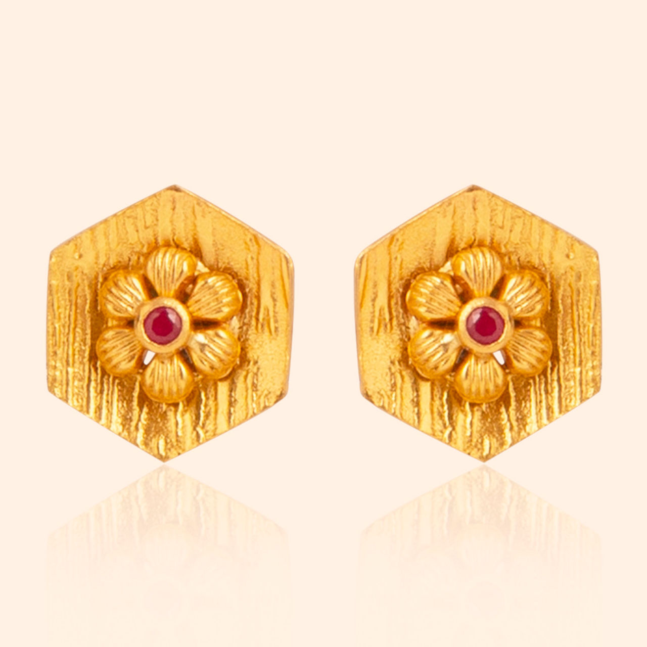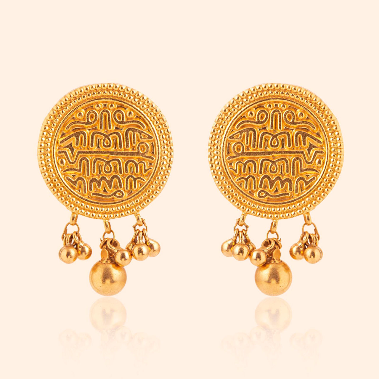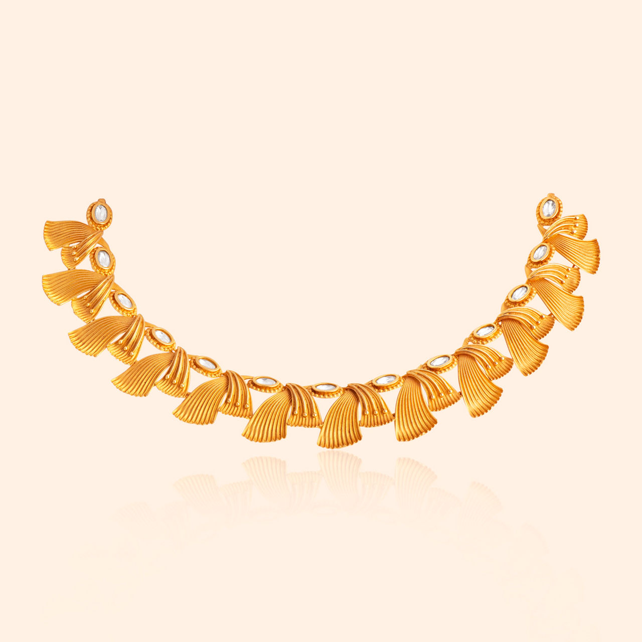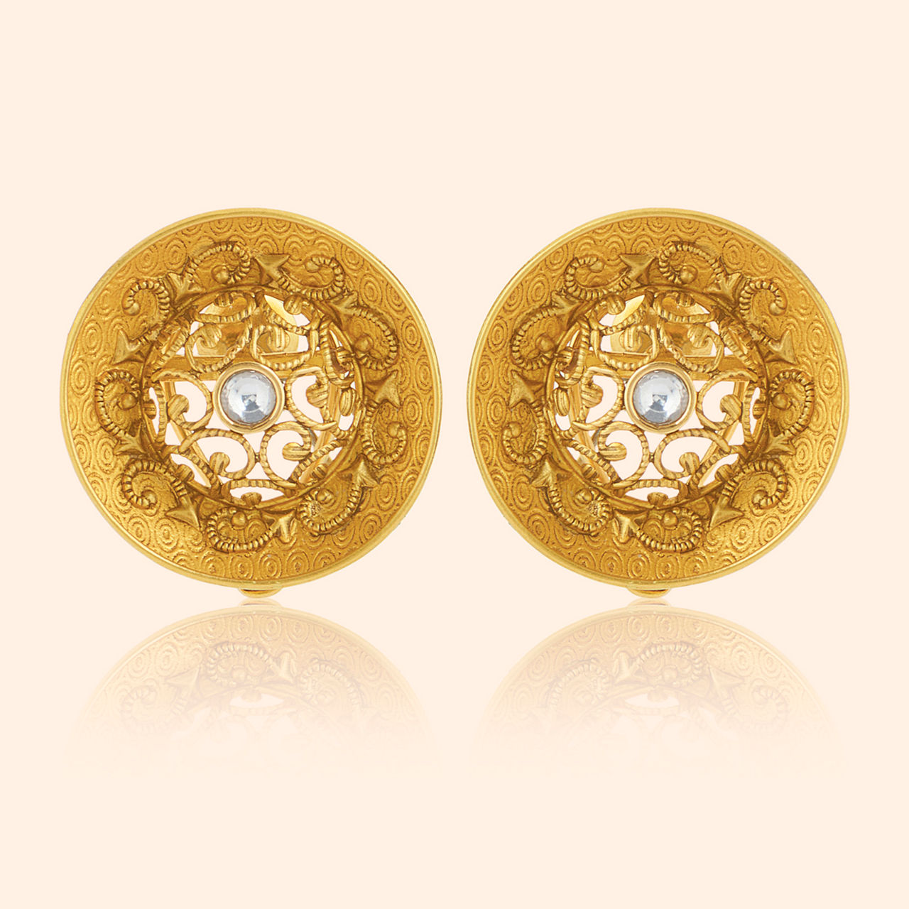 These 22KT yellow gold stud earrings blend ethno-contemporary design with the fluidity of abstract artistry. Adorned with delicate glass kundan stones, they offer a sophisticated yet modern aesthetic, perfect for light occasion wear. Their understated elegance makes them a versatile choice for both casual gatherings and more refined events, adding a touch of unique charm to any ensemble. These studs bring together contemporary flair with traditional craftsmanship, ideal for the woman who values both subtlety and style.