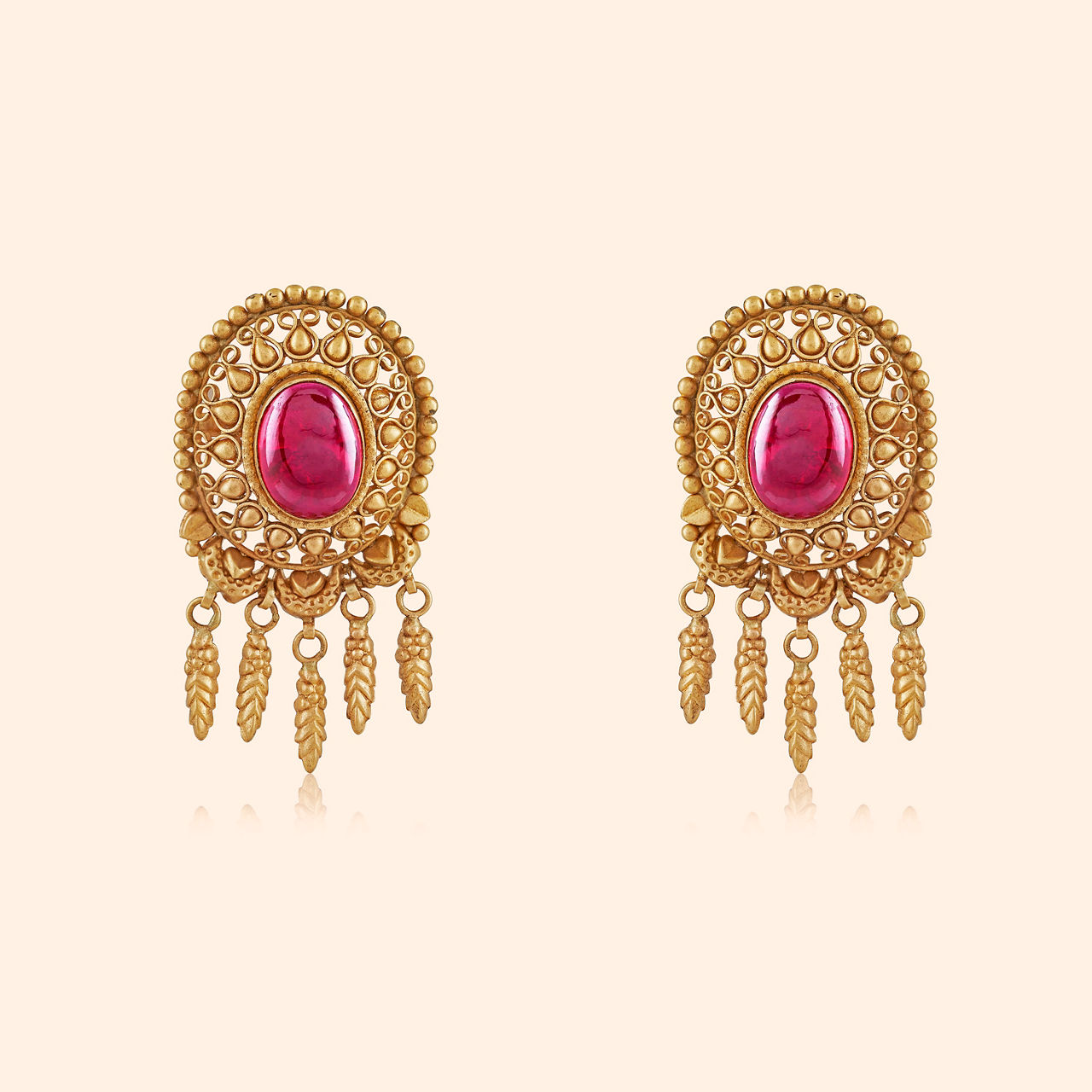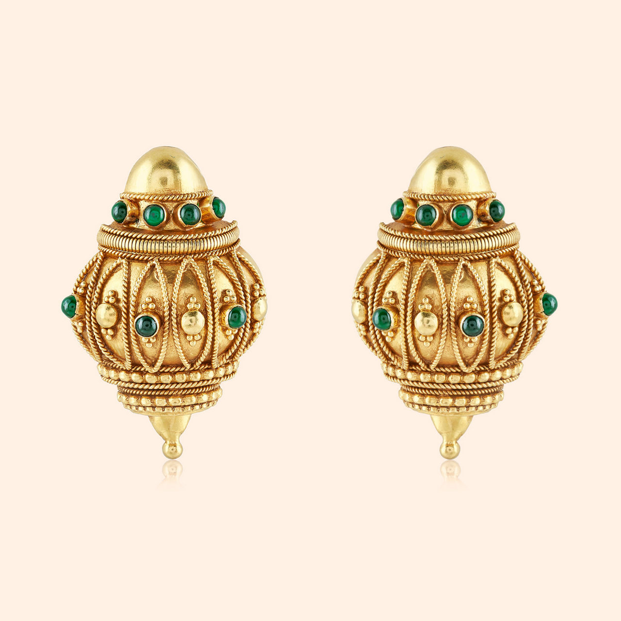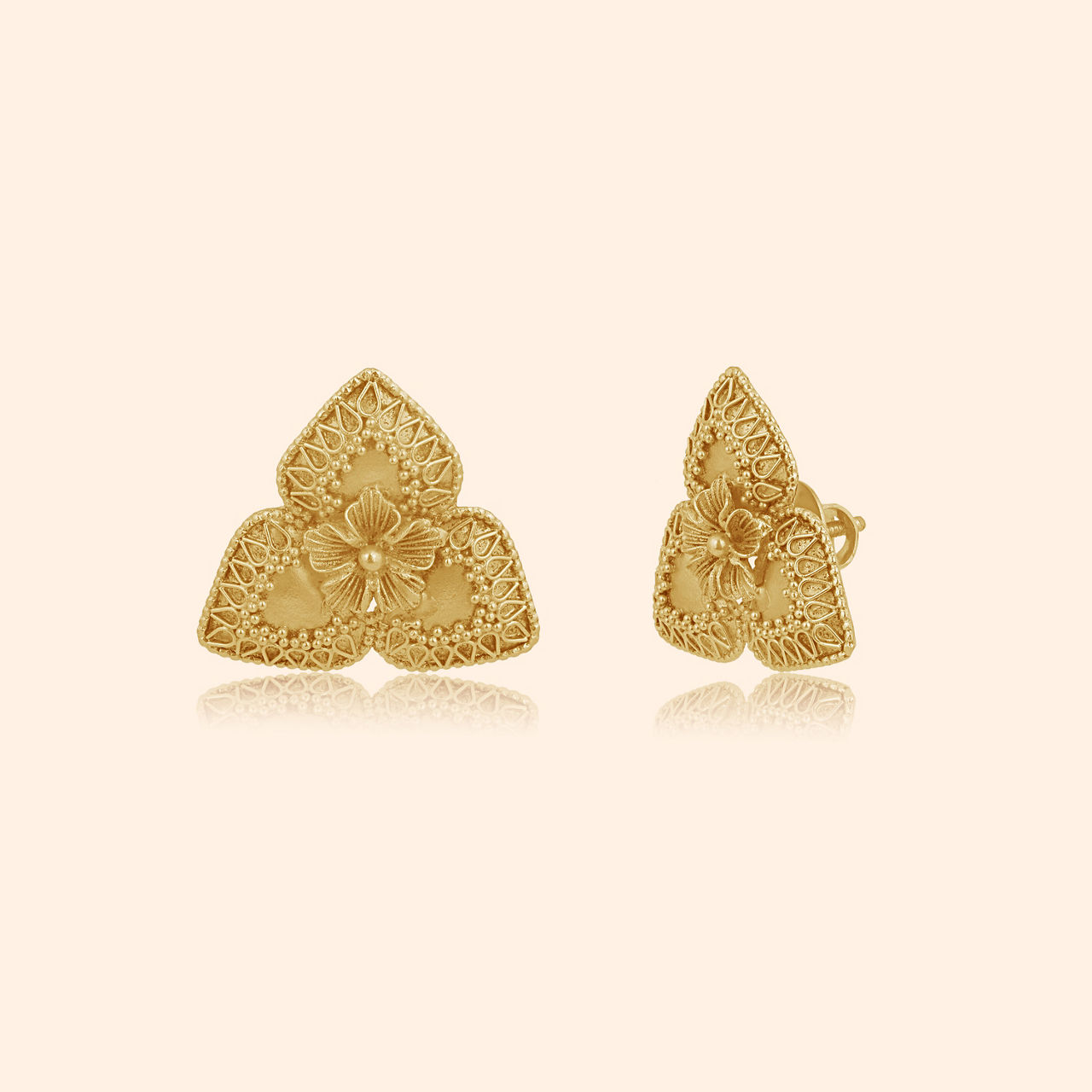 These 22KT yellow gold stud earrings blend ethno-contemporary design with the fluidity of abstract artistry. Adorned with delicate glass kundan stones, they offer a sophisticated yet modern aesthetic, perfect for light occasion wear. Their understated elegance makes them a versatile choice for both casual gatherings and more refined events, adding a touch of unique charm to any ensemble. These studs bring together contemporary flair with traditional craftsmanship, ideal for the woman who values both subtlety and style.