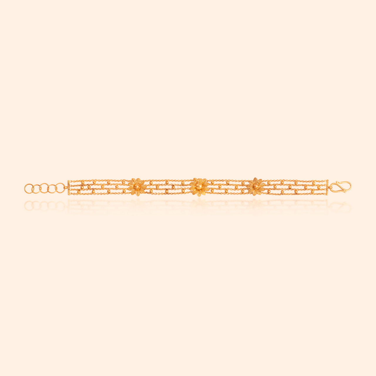 This bracelet, crafted from 22KT gold, seamlessly merges traditional elegance with modern charm. Its antique finish and the geometric placement of gemstones red and pearl stones create a refined look. Perfect for light occasion wear, this bracelet offers an understated yet captivating touch, bringing a burst of color and grace to your ensemble. Ideal for those who appreciate subtle richness with a hint of vibrant allure.