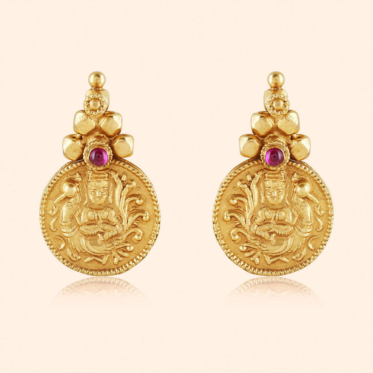 Ancient coins tell tales of yore, symbols cherished evermore, linked with beads and crescent moons, humming forgotten tunes. This gold necklace is steeped in heritage, featuring intricately embossed coin-like elements interspersed with golden beads and crescent motifs, all strung together with traditional thread work at the ends. This short necklace is a beautiful homage to temple jewellery styles, perfect for embracing cultural richness. It is crafted with exceptional detail in venerable 22 karat yellow gold.