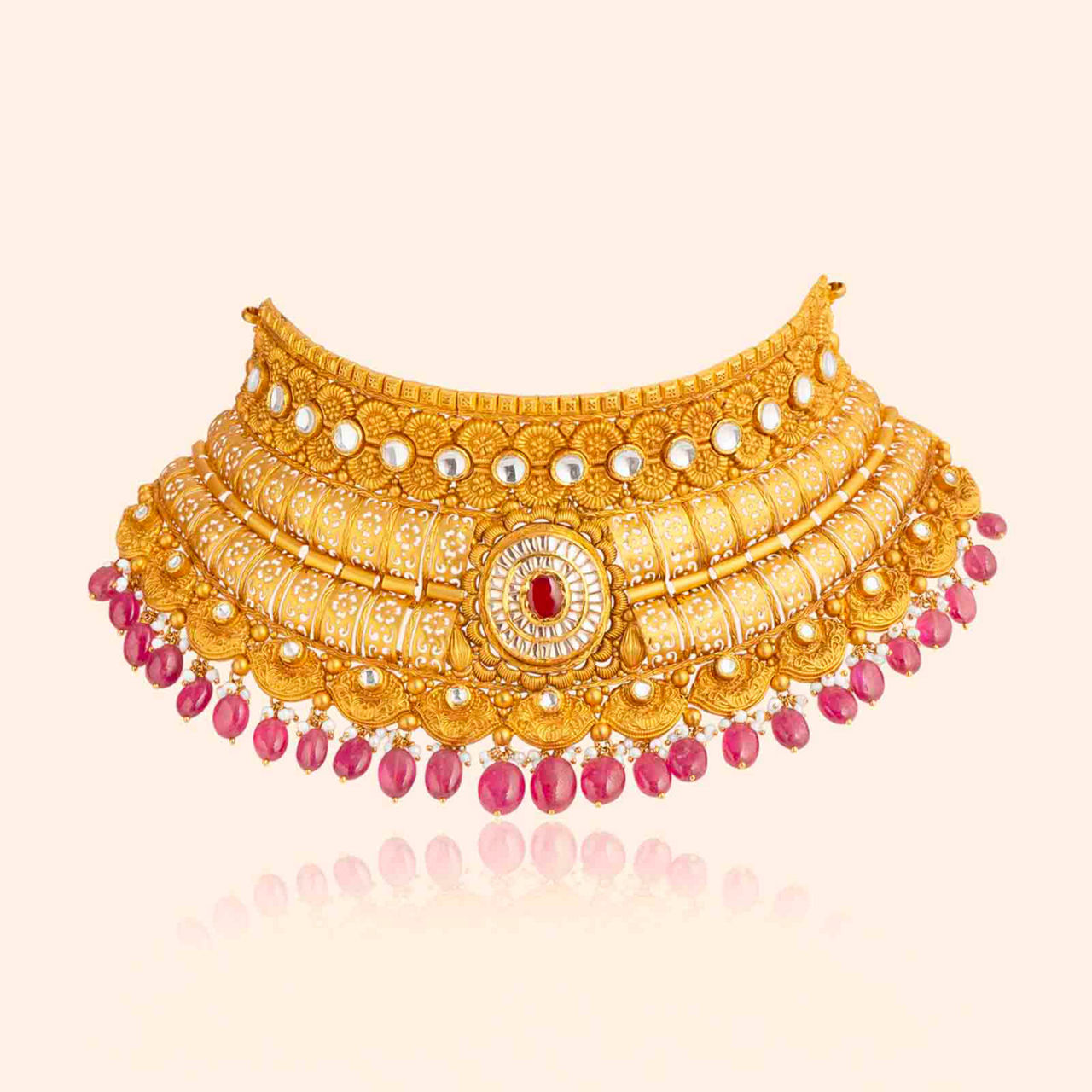 Solar blooms with ruby hearts aglow, jhumka bells where pearl drops softly flow, regal elegance wonderfully show. These earrings are a masterpiece of traditional design and festive colour. Featuring ornate floral studs set with central rubies and surrounding polki-like elements, they suspend classic jhumka bells adorned with intricate cutwork. Delicate white pearls and larger pink bead drops add a touch of softness and graceful movement. Perfect for bridal or formal occasions, these earrings radiate opulence. They are exquisitely crafted in rich 22 karat yellow gold, capturing timeless Indian festive spirit.