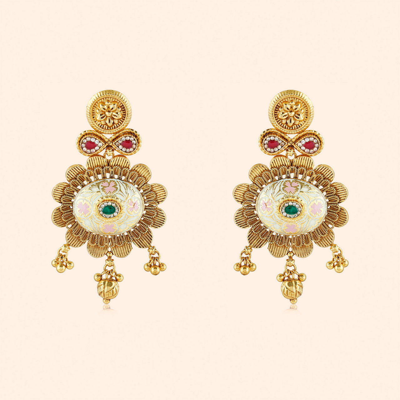 Golden strands descend in layers soft and low, adorned with gems that subtly gleam and glow, a multi-tiered elegance meant to surely show, beauty starts to grow. This necklace offers sophisticated dimension, featuring three delicate beaded gold chains tiered gracefully. Each strand is accented with floral motifs and bezel-set gemstones in subtle colours, creating a piece rich in detail and traditional charm, perfect for festive occasions. It is elegantly strung and crafted in 22 karat yellow gold.