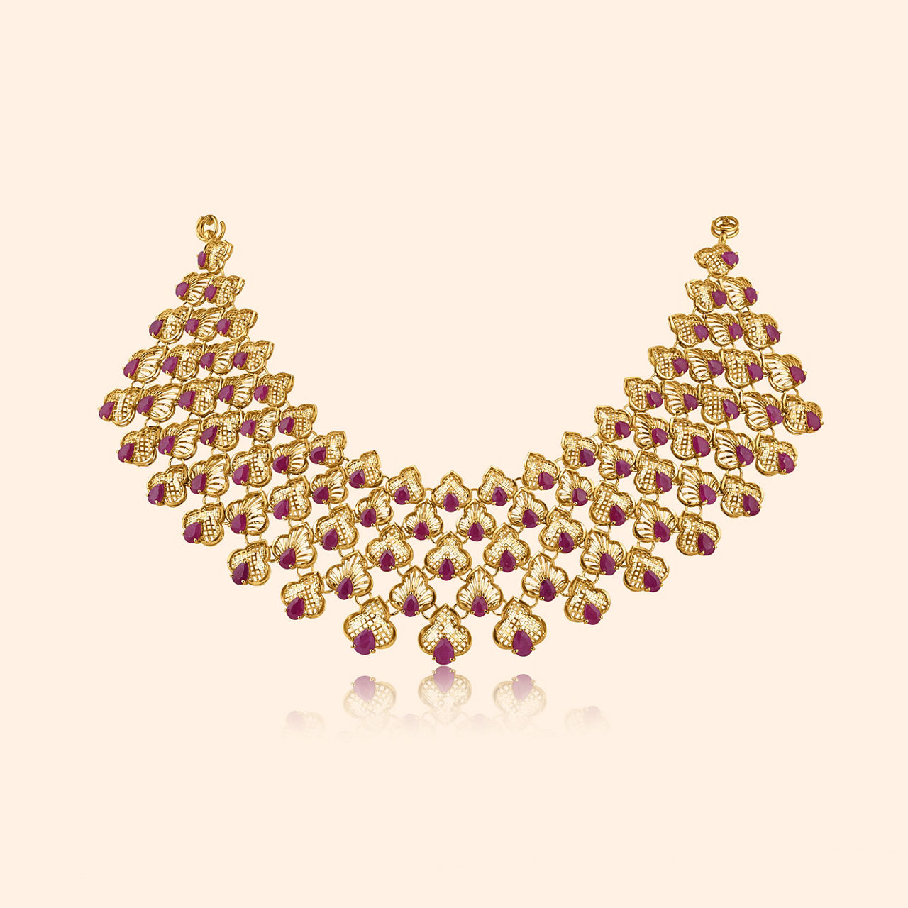 Like a jewelled peacock feather spread where ruby teardrops brightly gleam, these earrings fulfill opulent desire, a magnificent golden dream, luxurious supreme. These gold earrings present a breathtaking cascade of design elements, starting with an intricately latticed top stud. Below this, a series of fan-like segments, each adorned with delicate filigree and punctuated by vibrant ruby-coloured stones, create a spectacular chandelier effect. Each earring culminates in a fringe of these rich stones, adding movement and luxurious weight. They are a masterpiece of design, perfect for grand occasions, fashioned from lustrous 22 karat yellow gold.