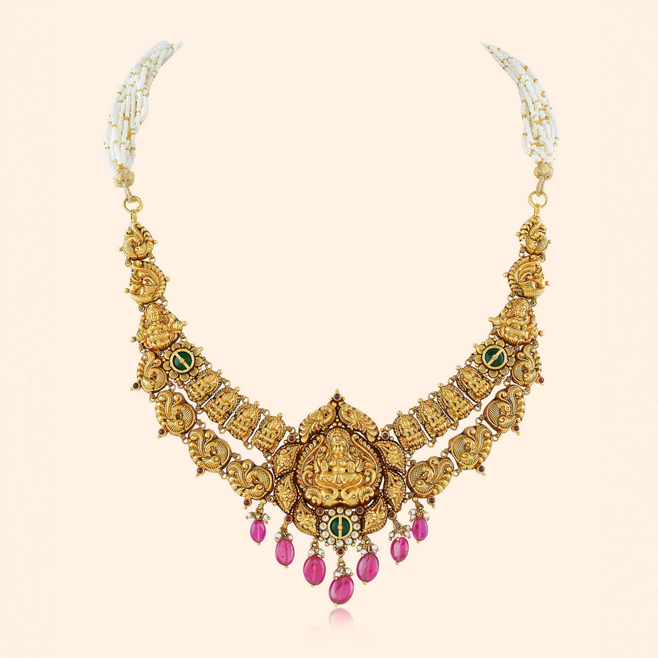 Sacred temple forms whisper tales of yore sublime, bells that echo through all time, capturing faith in every chime. These ornate earrings draw from the grandeur of temple jewellery, beginning with sculpted divine elements atop the ear. Below, intricately carved domes feature seated goddess forms surrounded by lotus and scrollwork motifs. Ruby-toned stones and sparkling accents bring colour, while golden beads form a delicate fringe. An antique patina adds timeless depth to this piece, crafted reverently in 22 karat yellow gold.