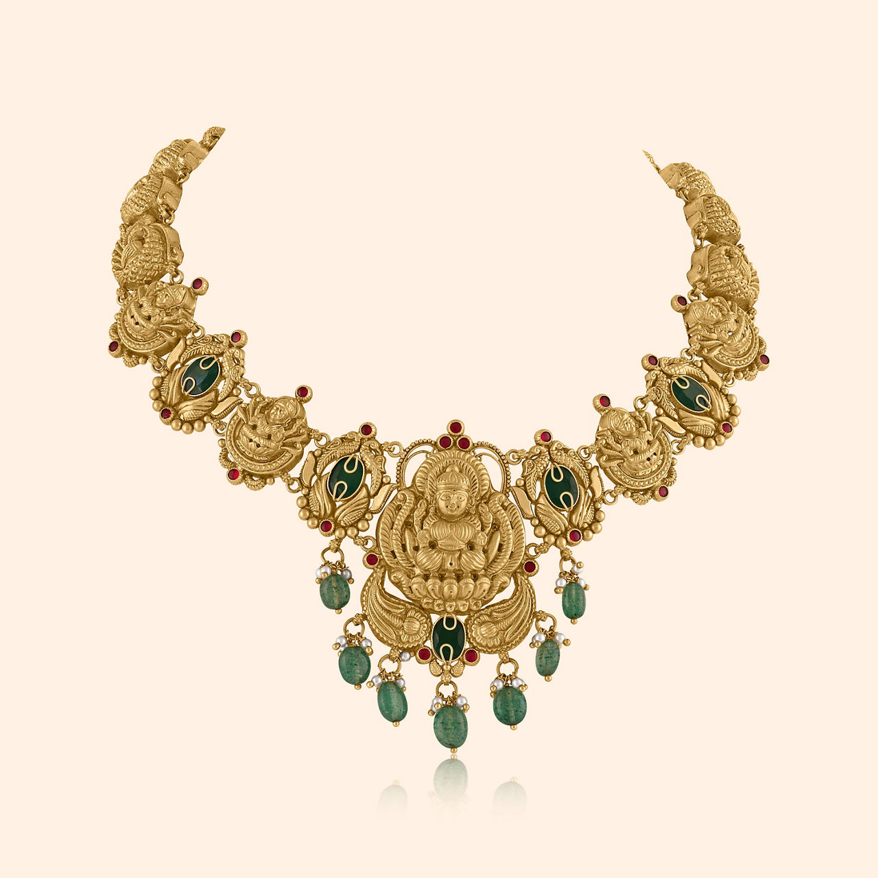 Goddess motif resides where blessings softly flow, emerald teardrops dangle, swinging to and fro. These unique drop earrings carry deep cultural significance, featuring an embossed image of the goddess, on the upper stud. Below, an ornate structure incorporating stylized elements and a central green stone connects to dangling tassels of lustrous pearl and green beads. Accents of red stones add a vibrant touch. The earrings blend devotion with traditional artistry, crafted in rich 22 karat yellow gold.