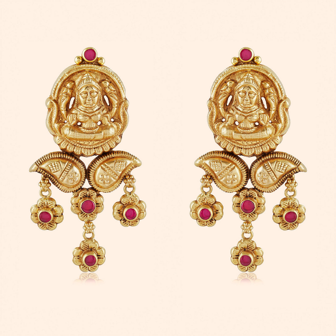 Where ancient tales in golden hues unfold, A divine embrace, gracefully to hold. Crafted in the rich glow of 22KT yellow gold, this necklace showcases a rare antique finish that speaks of timeless heritage. Each intricately carved medallion features the revered Deep Nakashi motifs of Goddess Lakshmi and majestic peacocks, an elevated traditional design that exudes spiritual grandeur. Subtle crimson gemstones accent the design, adding a touch of auspicious colour. Perfect for light occasion wear, this necklace will beautifully complement a flowing chiffon saree or an elegant festive kurta set, making you feel adorned in a legacy of divine artistry.