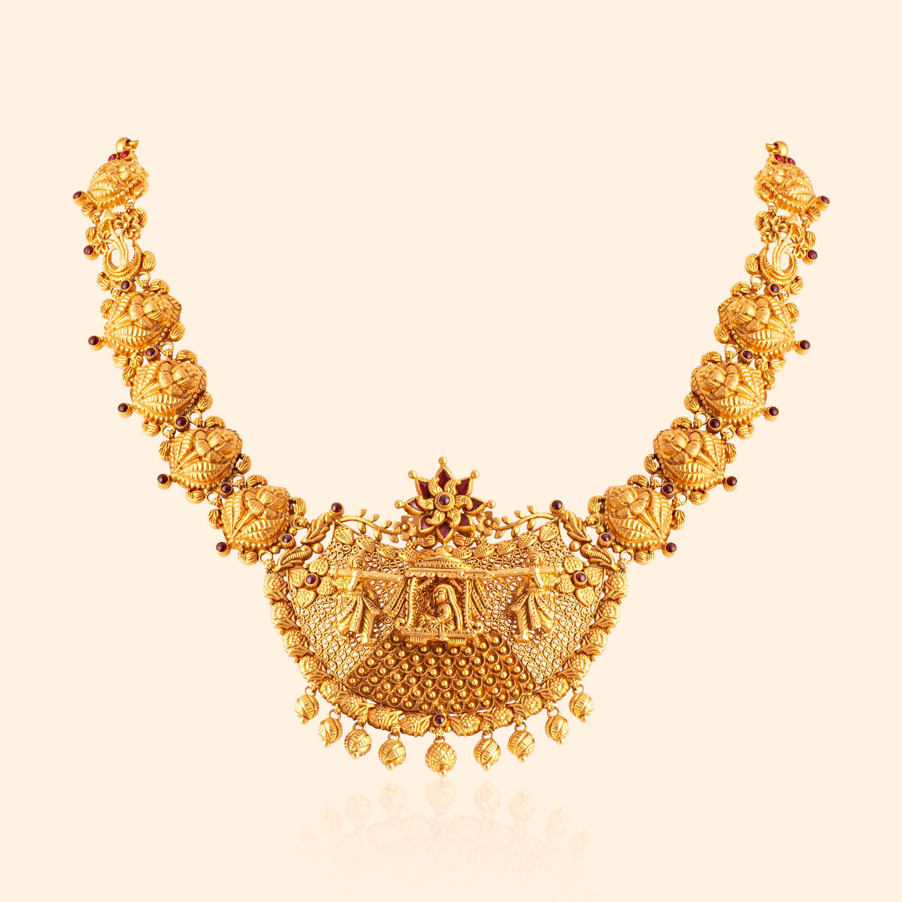 Regal motifs in gold richly bloom, dispelling shadows, chasing gloom, adorning beauty in the room. These magnificent drop earrings evoke heritage splendour, featuring an ornate design inspired by temple architecture and divine figures. A vibrant floral stud, set with deep red stones, gives way to a grand rectangular element depicting a traditional scene, framed by intricate gold work and bead detailing, finished with dangling gold spheres. They are masterfully crafted in radiant 22 karat yellow gold, perfect for traditional celebrations.