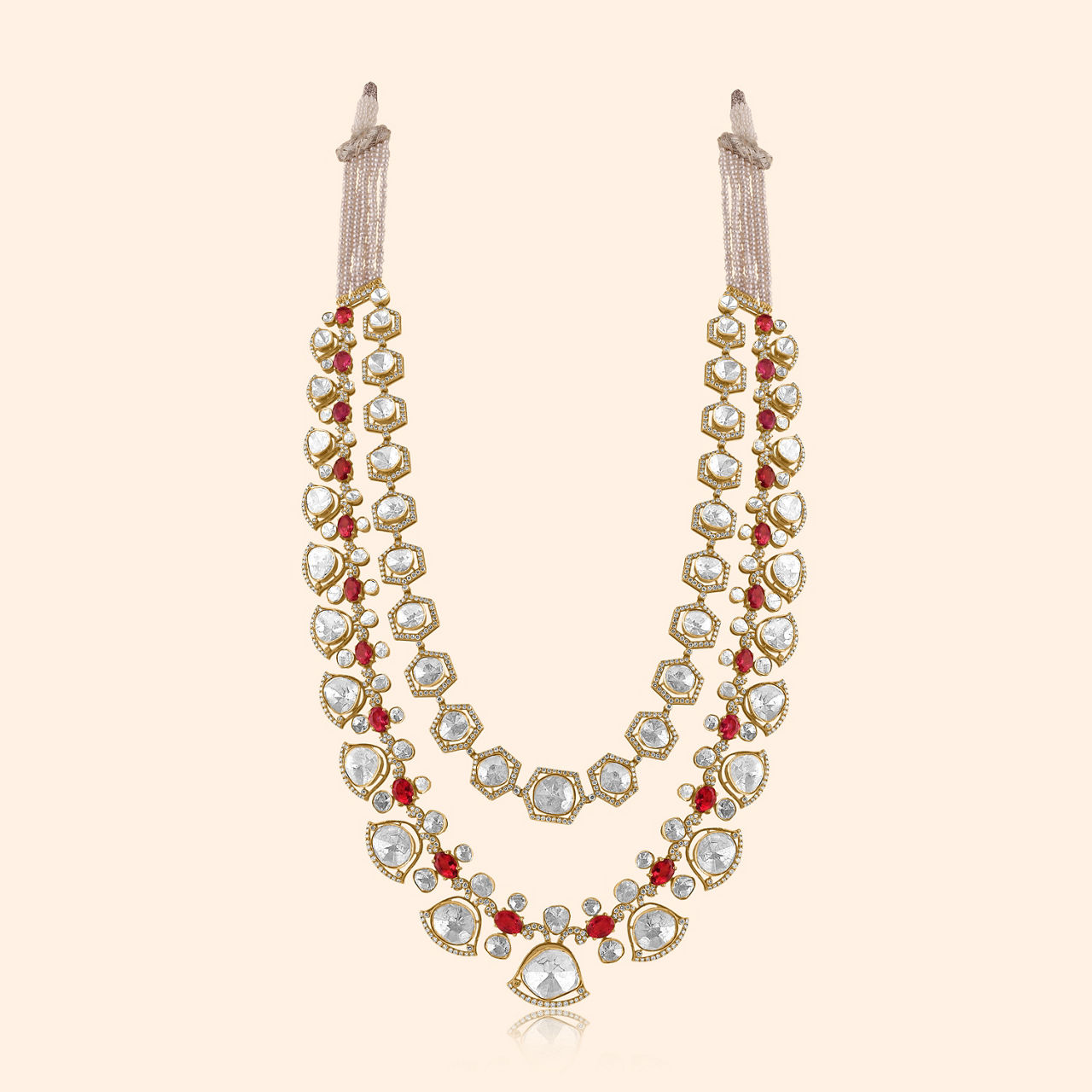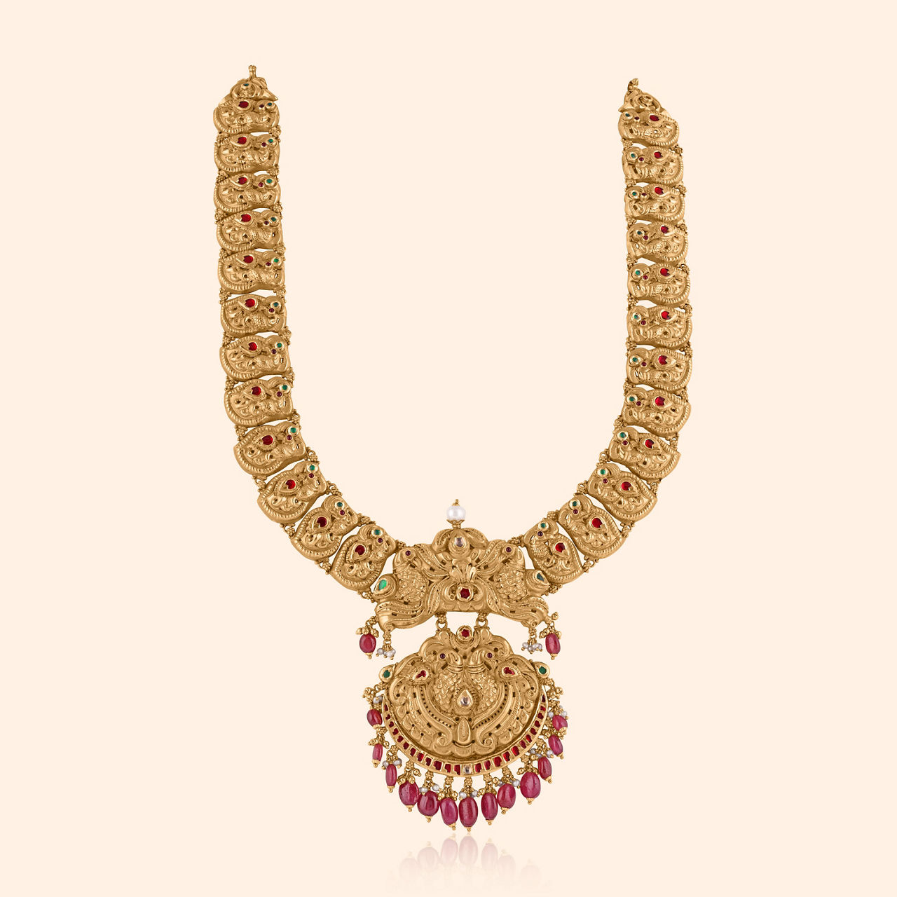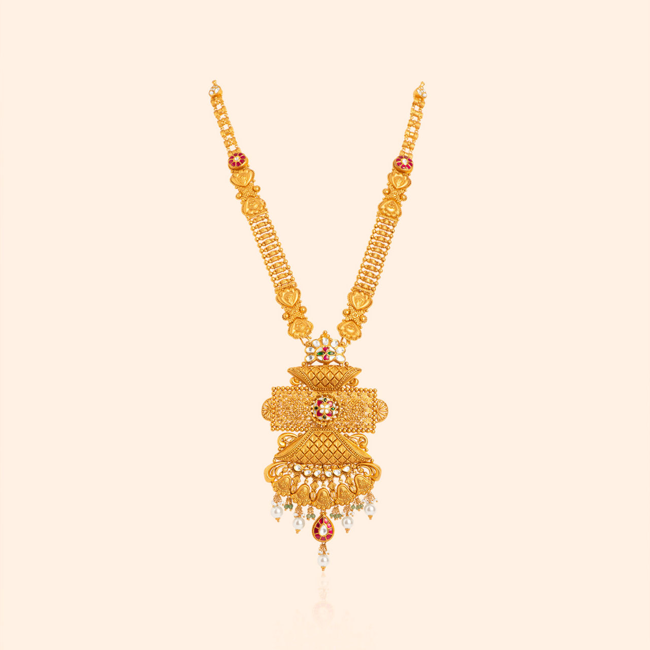 Crafted in 22KT yellow gold, this long necklace embodies the perfect blend of traditional elegance and contemporary design. The intricate floral detailing, enhanced by a standard antique finish, brings an aura of regal beauty. Featuring rich red glass Kundan stones, it exudes a fierce, sophisticated charm. The detachable pendant offers versatility, making it easy to style for any occasion. Ideal for bridal wear, this handmade masterjewel promises to elevate your wedding look with its timeless beauty and versatile design.