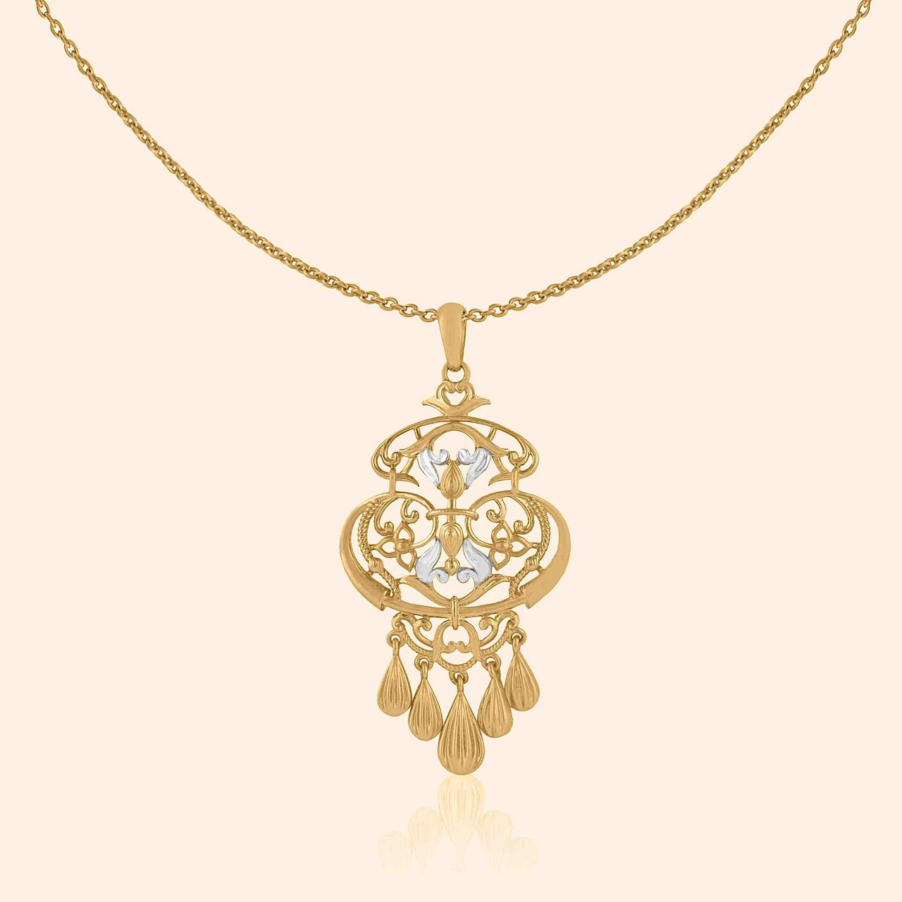 Golden filigree weaves a tale so grand, teardrops fall from loving hand, beauty blooms across the land. These earrings offer ethno-contemporary elegance, featuring an intricate openwork design with contrasting white gold heart accents, leading down to a graceful, fluted teardrop dangle. Their unique structure blends traditional artistry with modern sensibility, creating lightweight yet eye-catching appeal. Crafted in gleaming 22 karat yellow gold.