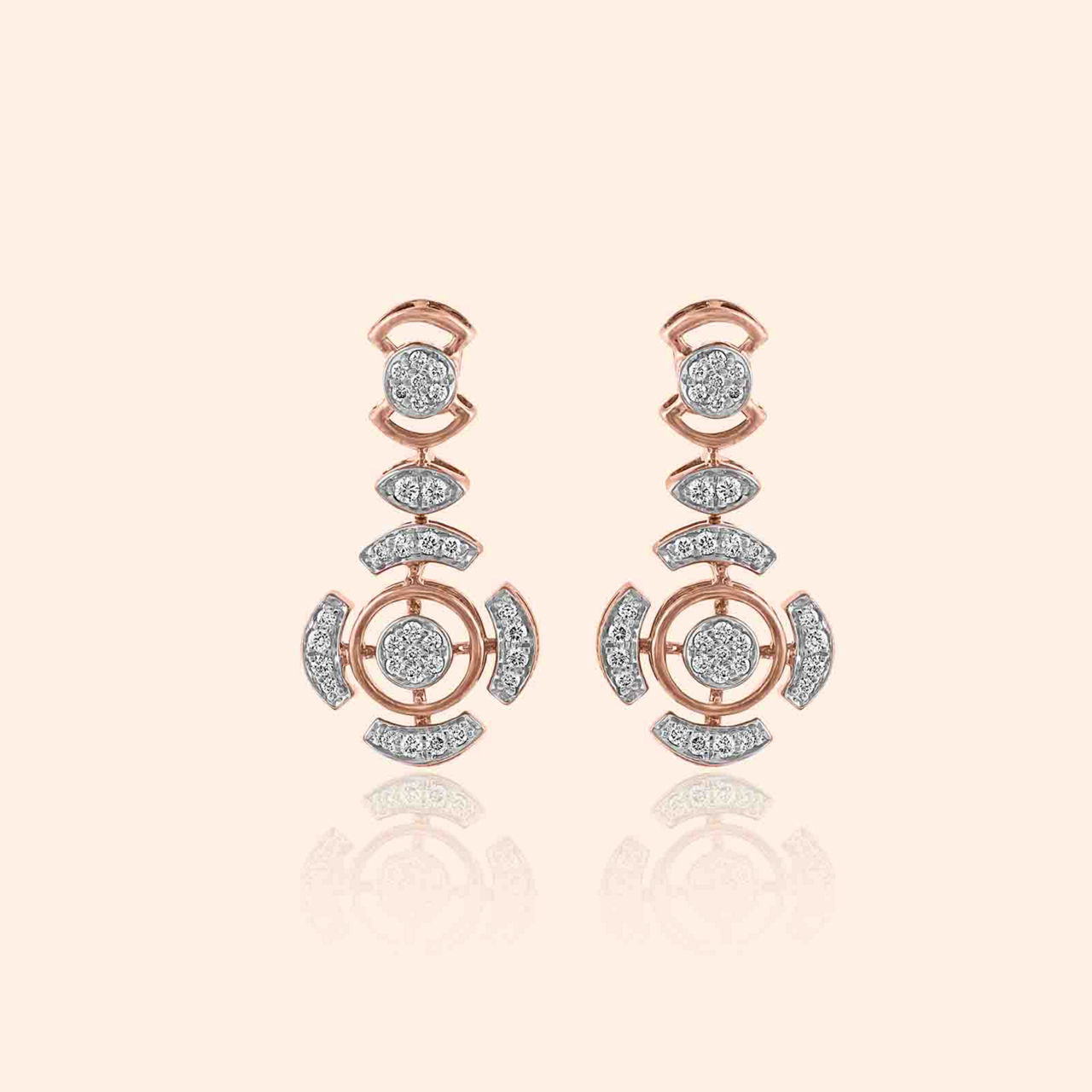 A graceful interplay of light and artistry, this 18KT rose gold piece shimmers with diamonds, forming intricate circular motifs along its sides. The design flows organically, evoking delicate floral inspiration while maintaining a modern aesthetic. Perfect for light occasions, it captures attention through subtle brilliance and meticulous craftsmanship. Each angle reflects gentle sparkle, offering an understated yet captivating elegance that elevates any ensemble with soft sophistication and refined charm.