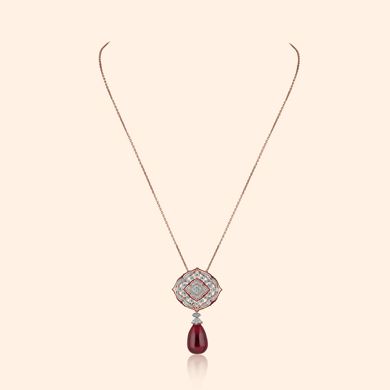 A vibrant flourish, born of light and passion's hue, these earrings whisper tales of grandeur, awaiting only you. Crafted in the warm glow of 14KT rose gold, their modern design blossoms with an intricate floral motif. A constellation of brilliant diamonds, each stone reflecting light with dazzling clarity, enhances the high polish finish, creating a captivating sparkle. At their heart, a vibrant red gemstone unfurls, its deep hue echoing the fiery spirit of celebration. Designed for heavy occasion wear, these detachable drop earrings offer versatile elegance, transforming seamlessly to complement a grand lehenga or a flowing heavy silk saree, making a statement with every movement. Let these opulent treasures adorn your journey, celebrating every moment with unparalleled grace.