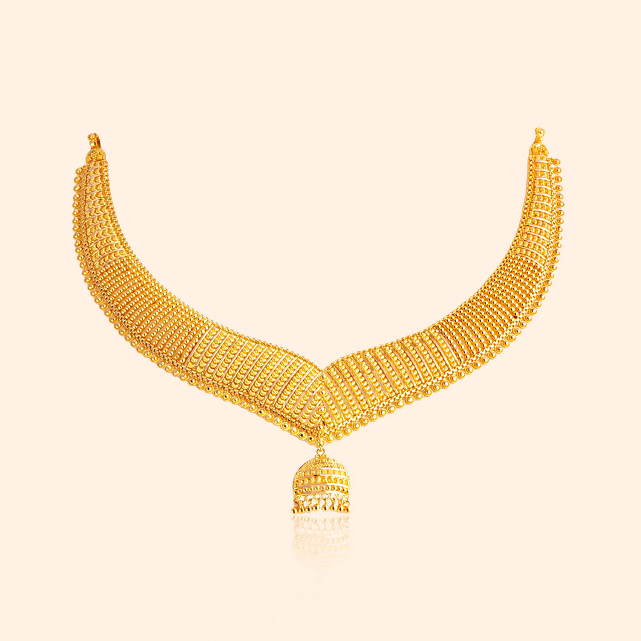 Designed for grandeur, these 22KT yellow gold drop earrings celebrate the harmony of floral and geometric elements. Handmade to perfection, their intricate details and fluid form exude traditional elegance, while the yellow finish enhances their luminous charm. Ideal for heavy occasion wear, this pair is a tribute to craftsmanship, carrying a legacy of beauty and sophistication.
