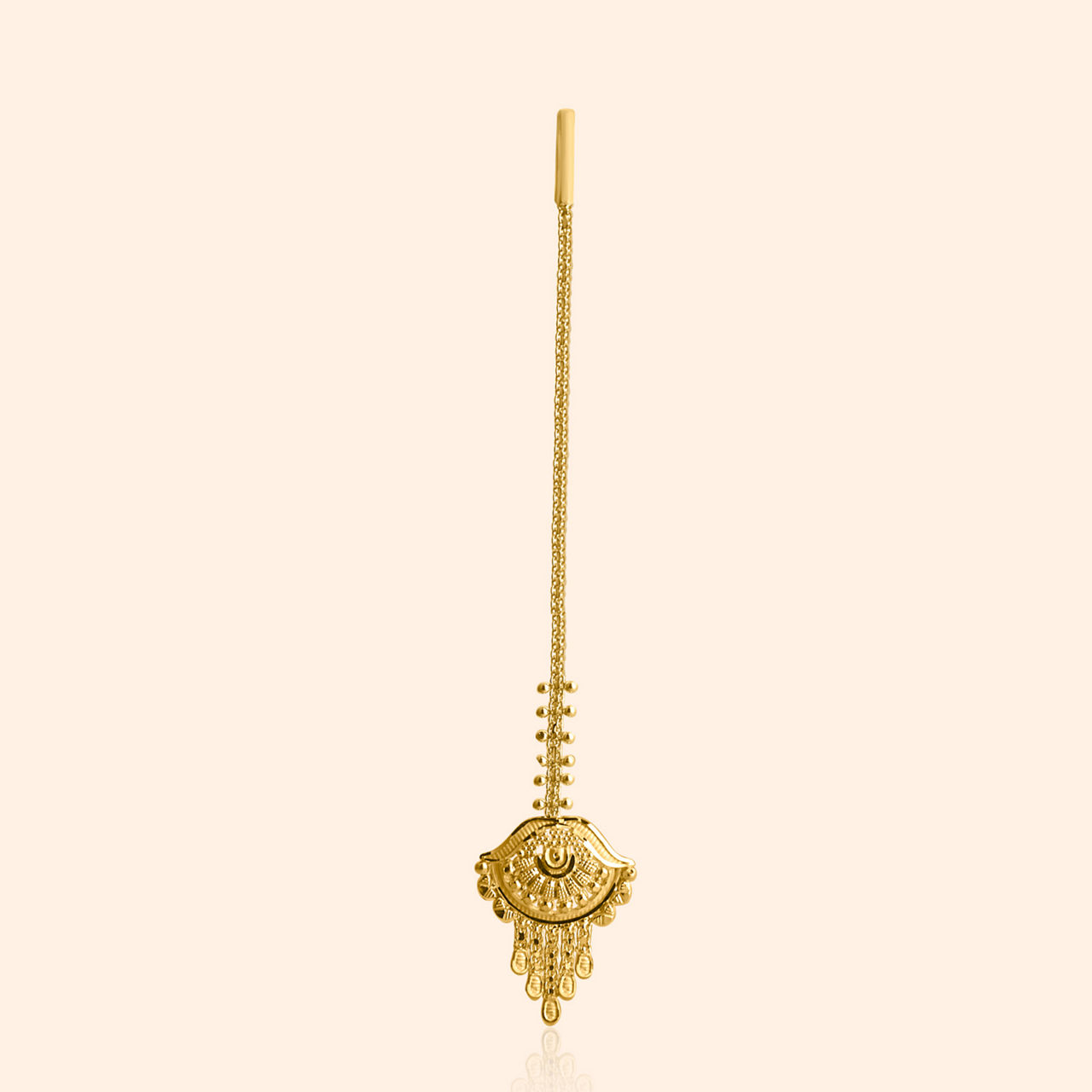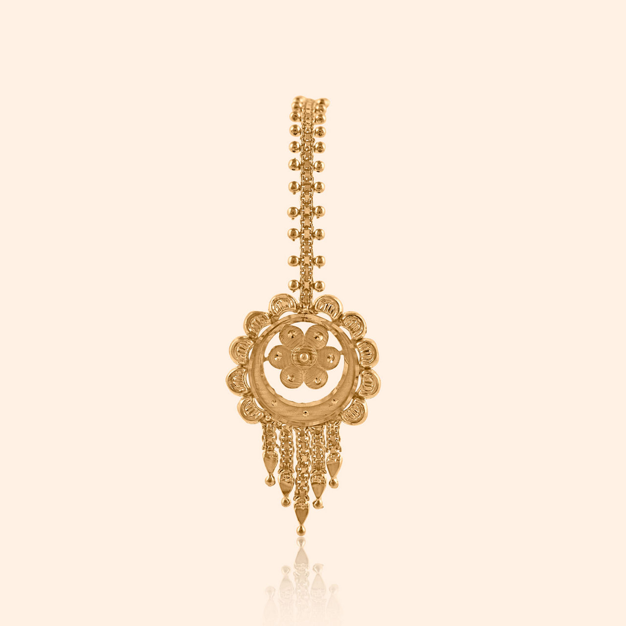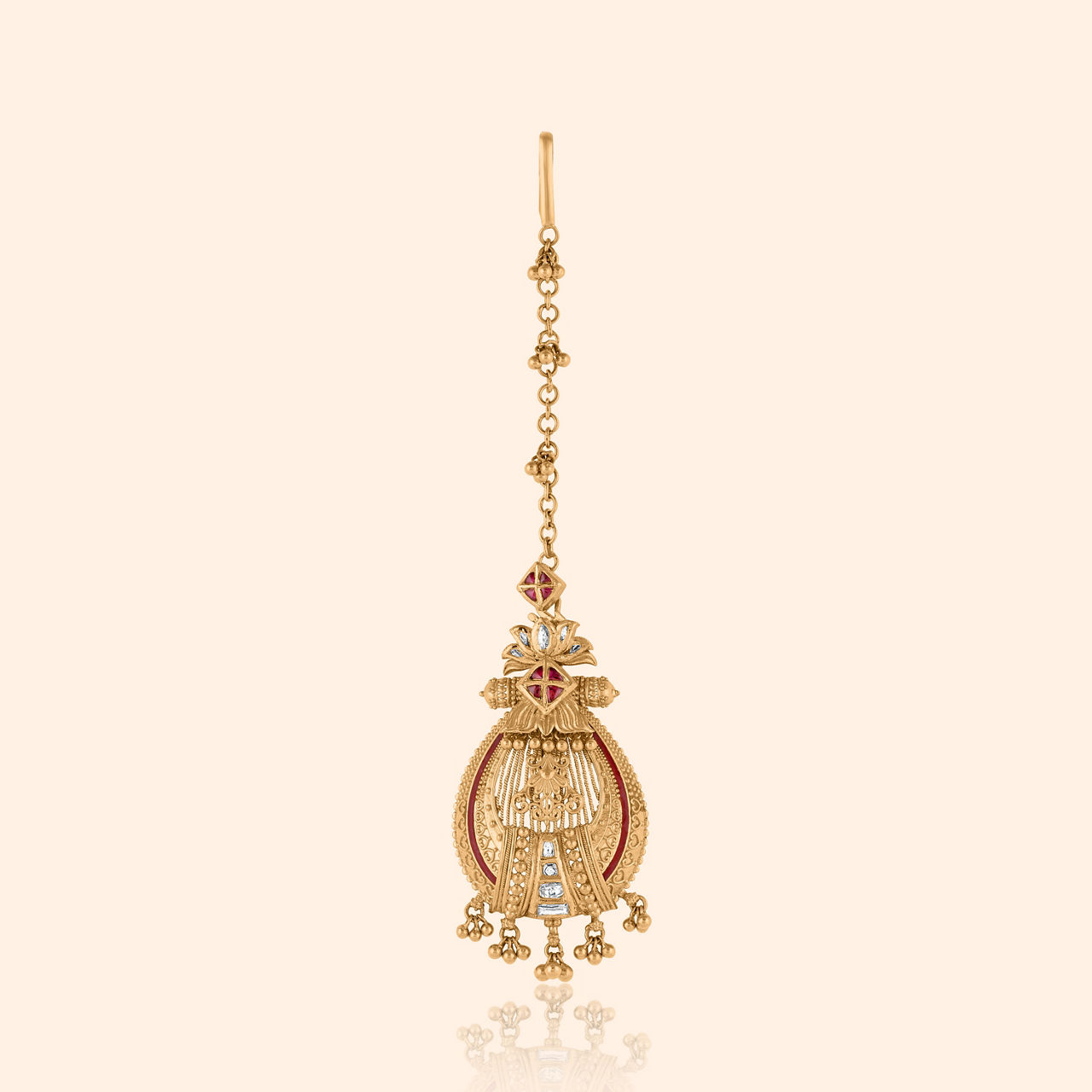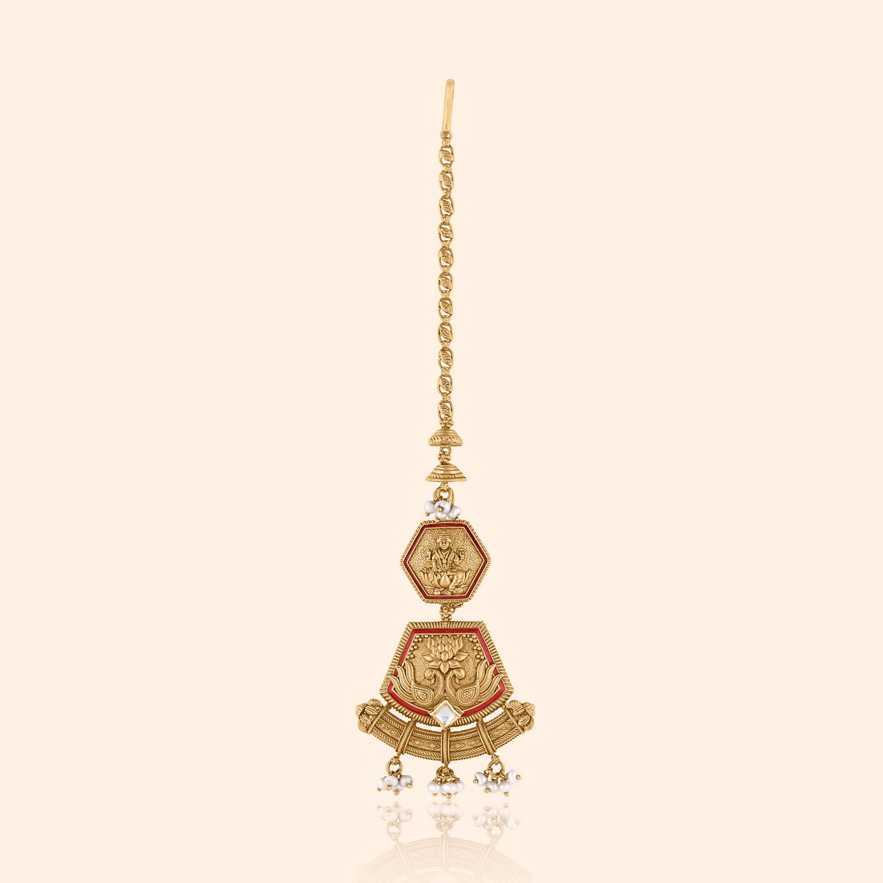 A whisper of history, a bloom of gold, for celebrations new, and stories yet untold. Crafted from lustrous 22KT yellow gold, this tikka embodies elevated traditional artistry with a captivating floral motif. Its antique finish lends a timeless charm, accentuating the vibrant red stones and delicate white accents. A graceful cascade of pearls sways gently, adding to its allure. Perfect for light occasion wear, this exquisite piece will beautifully complement your chiffon saree or a festive kurta set, gracing your brow with radiant elegance and a touch of heritage.