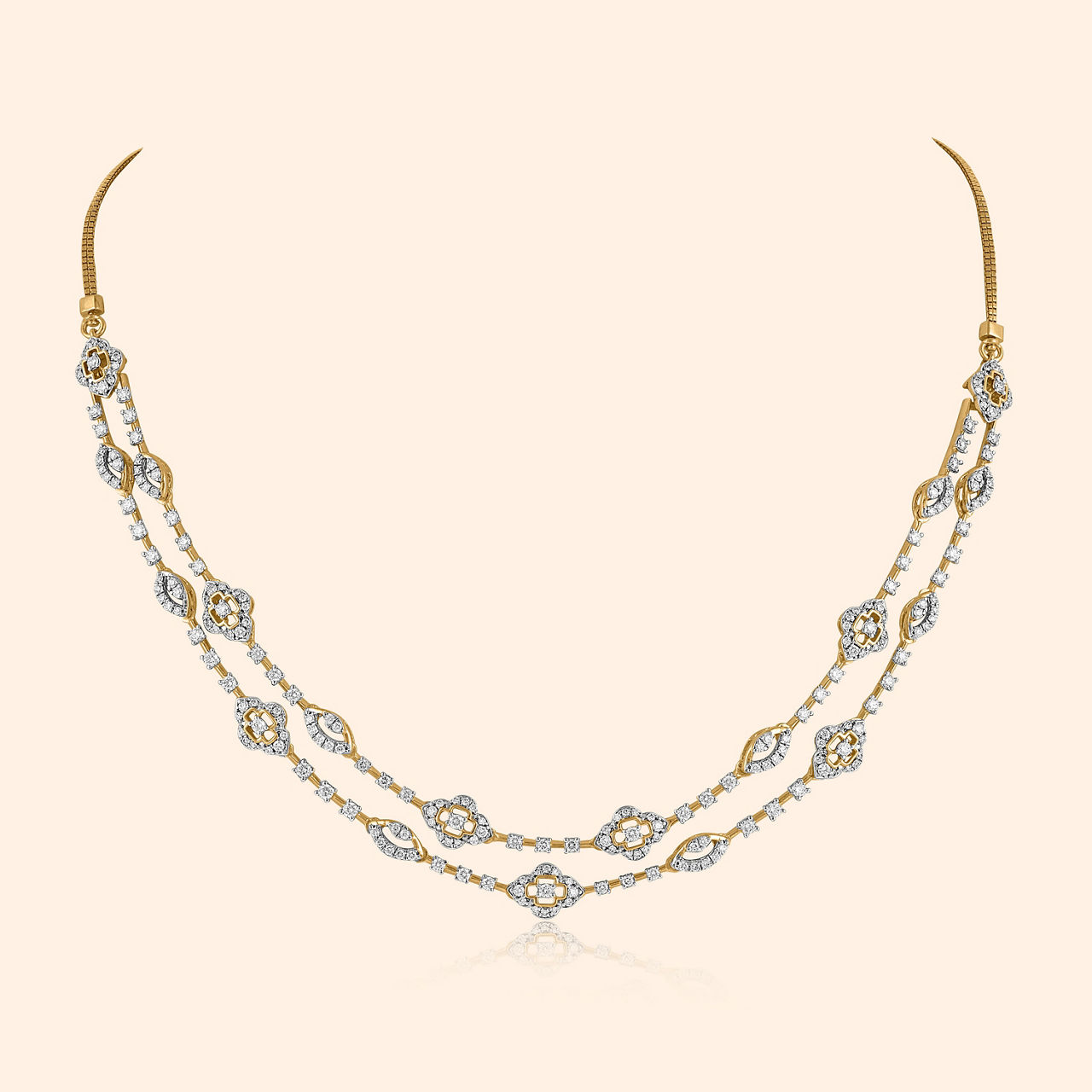Cascading motifs like blossoms gently fall, suspended in grace where diamonds call, capturing light, enthralling all. These earrings feature an elegant drop design, showcasing a series of linked quatrefoil and marquise-shaped elements adorned with brilliant diamonds. The interplay of polished gold framework and sparkling stones creates a sense of movement and refined luxury, reminiscent of a delicate garland. Exquisitely fashioned in radiant 18 karat yellow gold with rhodium accents, they blend traditional motifs with an elongated silhouette for timeless glamour, ideal for festive events or enhancing evening attire.