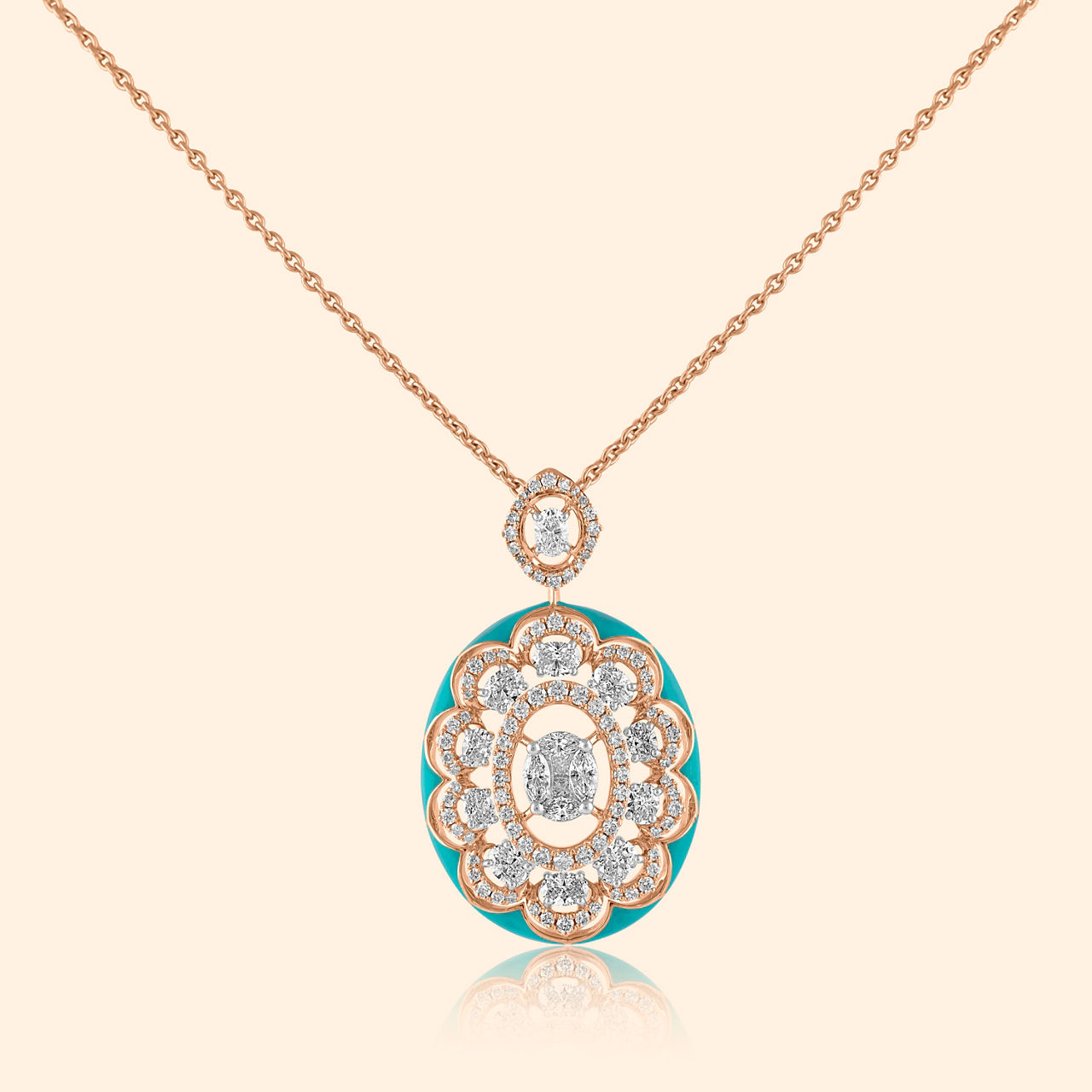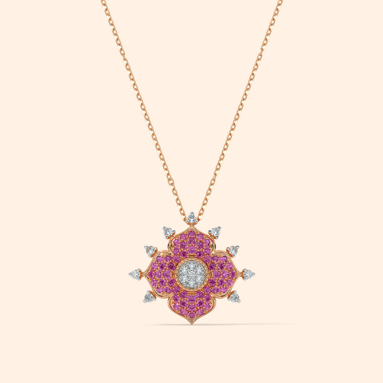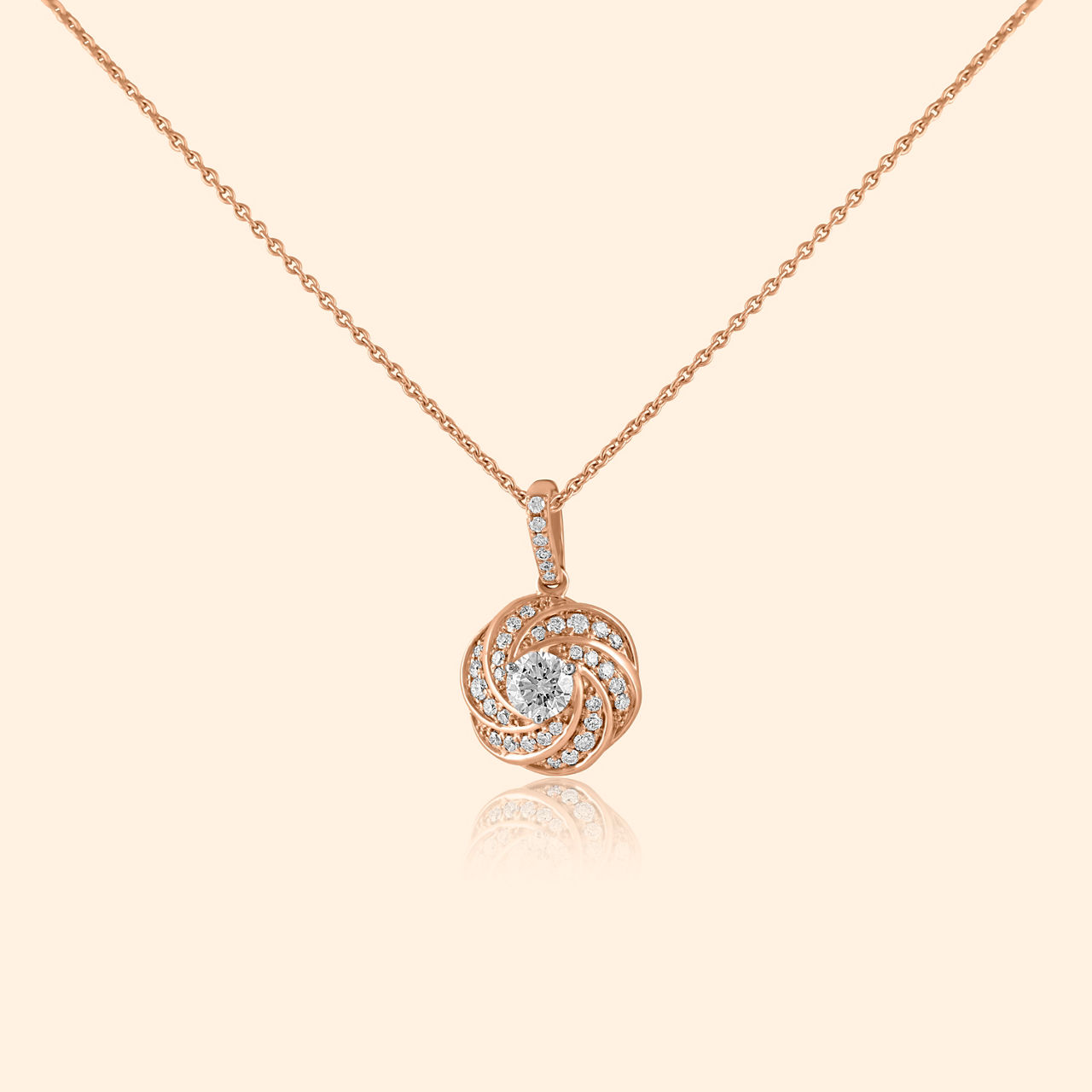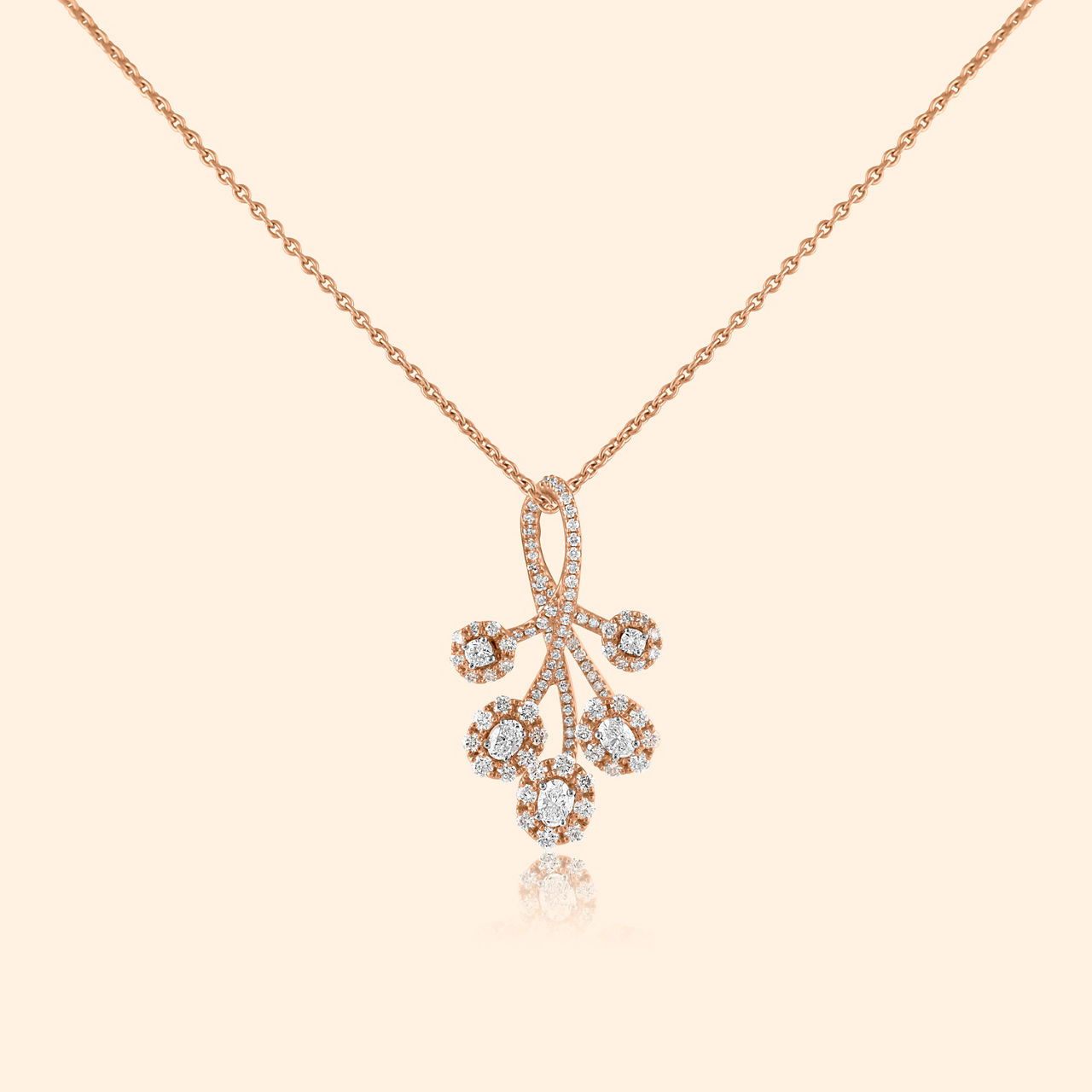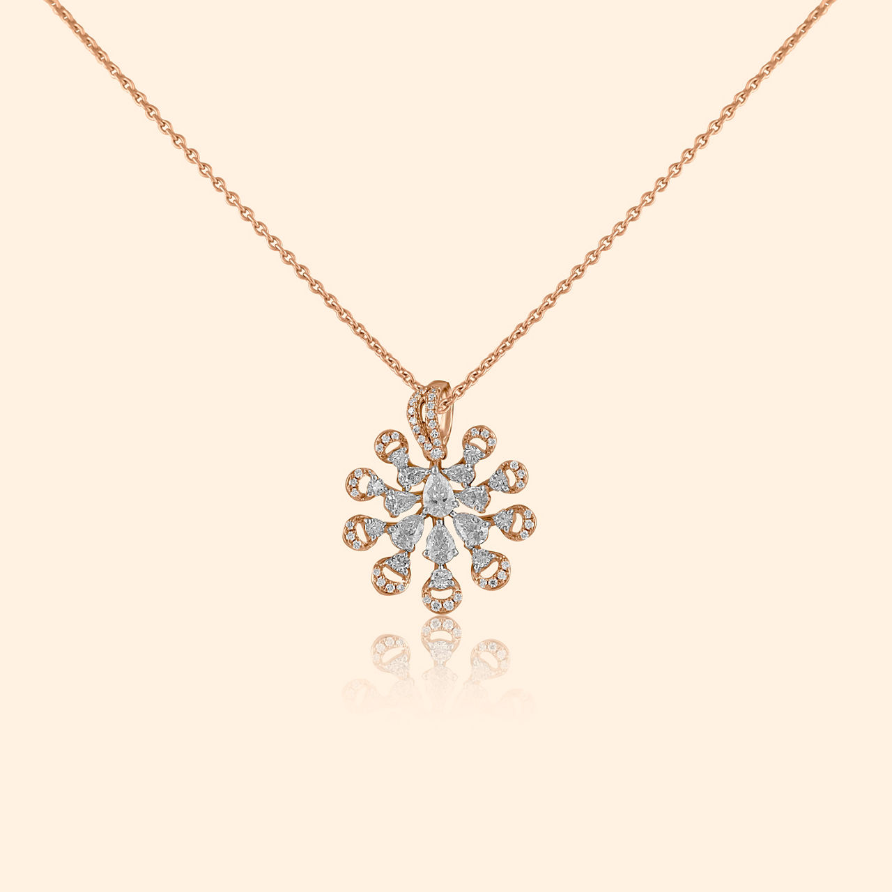A blossoming light unfolds at each gentle graceful turn, delicate sparkle from tiny gems that brightly burn, a lesson in beauty we learn. This diamond pendant captures the ethereal beauty of a flower in bloom with its airy and sophisticated design. It features a beautifully sculpted openwork floral motif, where the outlines of the petals are delicately traced with lines of scintillating diamonds. The negative space within the design lends it a wonderful lightness, allowing it to float gracefully against the skin or clothing. It evokes a sense of natural elegance and subtle luxury, perfect for everyday adornment. Exquisitely rendered in warm 18 karat pink gold, this pendant adds a whisper of sparkle to any look.