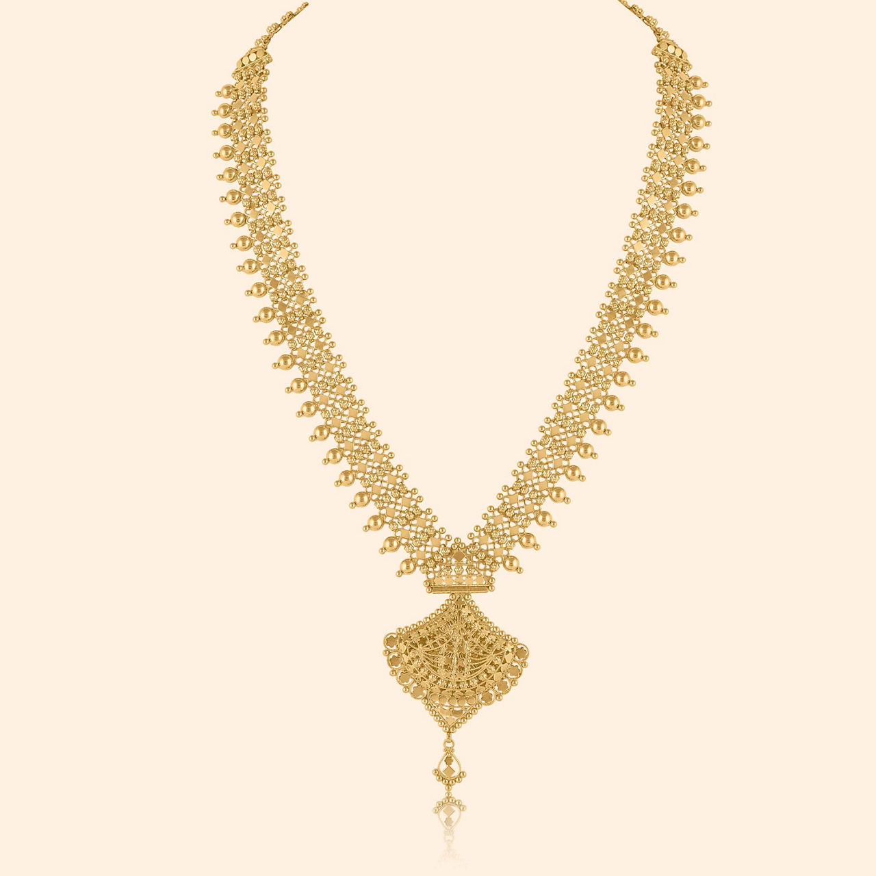 These 22kt yellow gold drop earrings, crafted for heavy occasion wear, feature a traditional geometric design that combines classic elements with modern elegance. Handmade with precision, these earrings highlight the beauty of symmetry and grace. They add sophistication to your ensemble, reflecting a sense of empowerment and style that makes a lasting impression at any event.