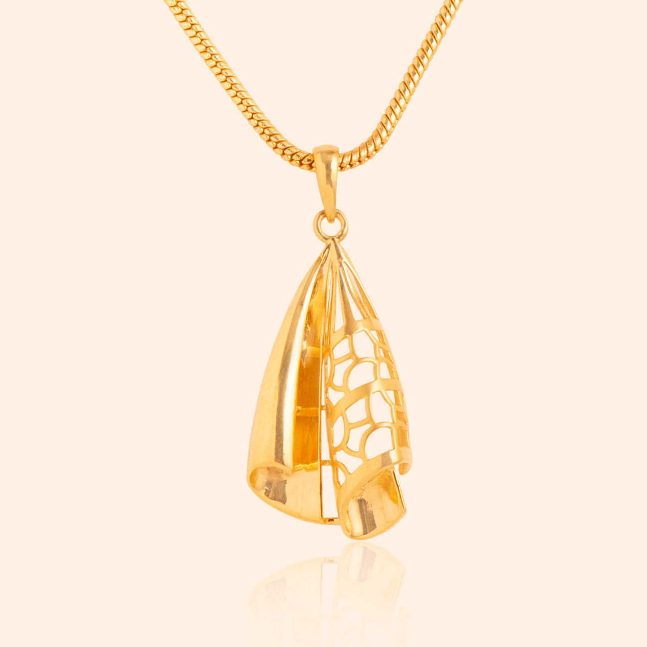 Sculpted wings of pure gold take flight, catching light within their modern, lattice-like structure, suggesting freedom found in contemporary elegance. These gold earrings feature a striking triangular silhouette with openwork design, showcasing geometric precision merged with a fluid, folded form. Their polished surfaces gleam, offering a modern interpretation of a classic stud, versatile for numerous occasions. These distinct earrings are fashioned from shining 22 karat yellow gold, embodying a refined, minimalist aesthetic with an edge.