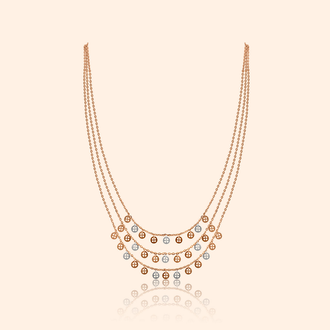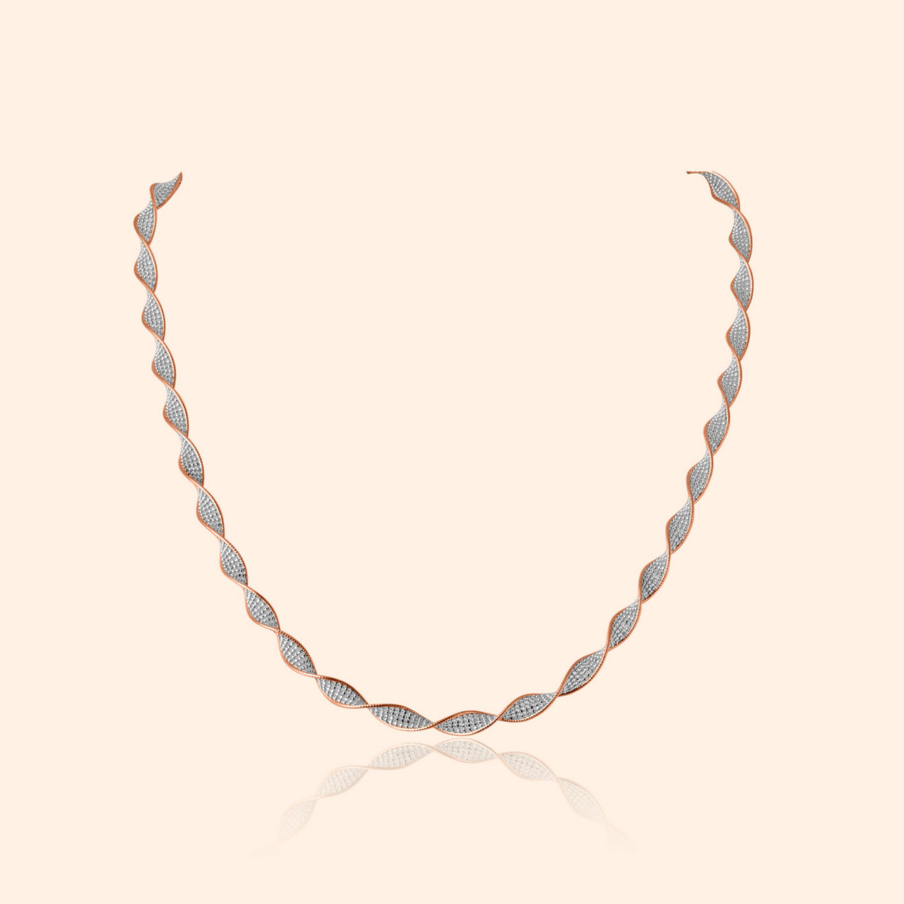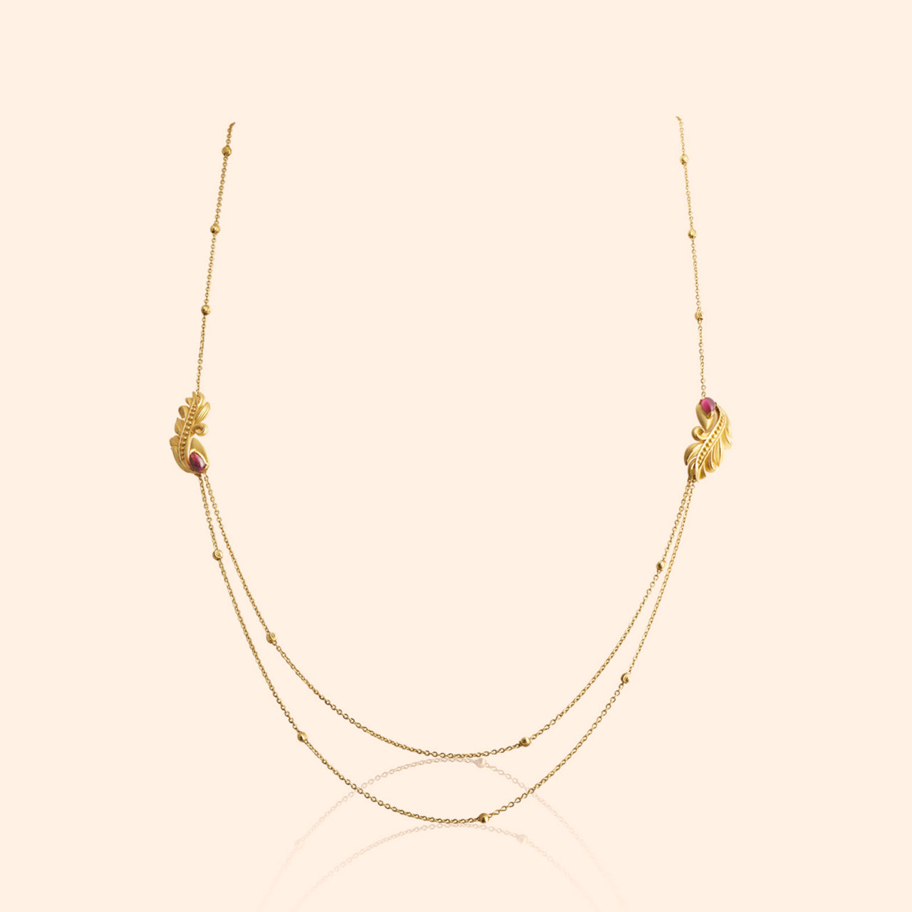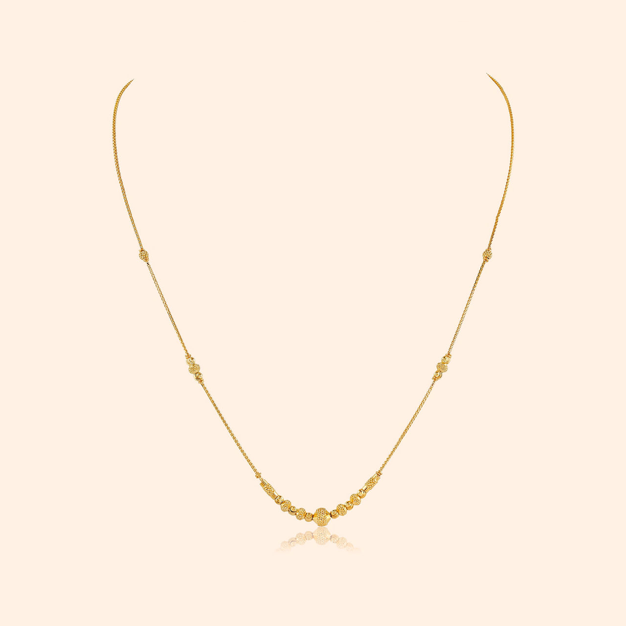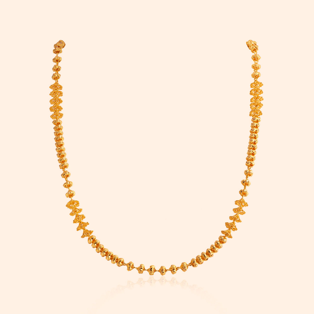 The intricate jasmine necklace, meticulously crafted in radiant 22 karat gold, evokes the fragrant melody of a blooming garden in full splendour. The very ornate floral motifs, etched with masterful artistry, are an ode to that eternal longing for spring.