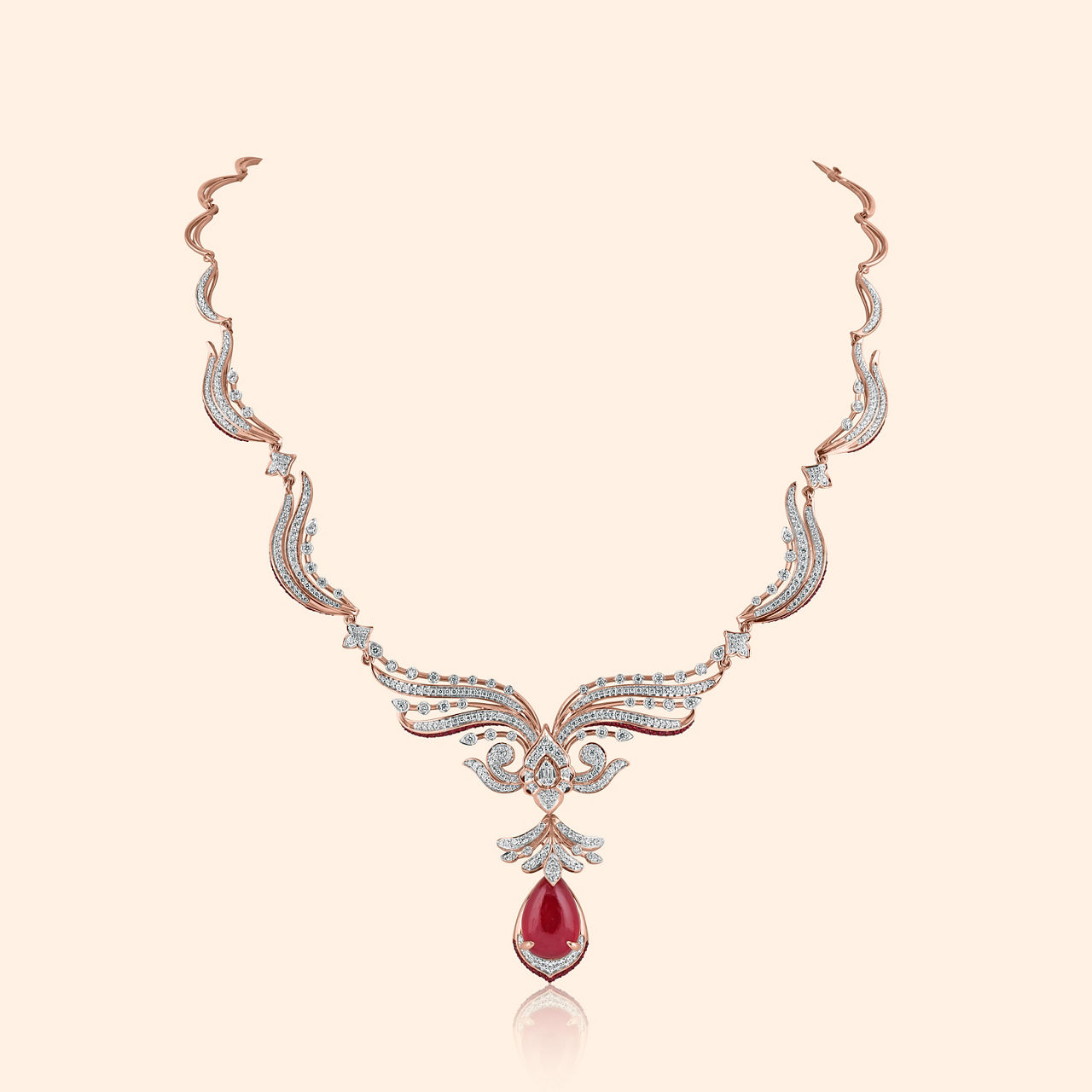 With a feather's regal sweep, and a vibrant heart so deep, these 14KT rose gold drop earrings capture the majestic allure of a peacock feather motif, adorned with dazzling diamonds. Polished to a brilliant gleam, their modern design speaks of contemporary elegance. A captivating vibrant pink stone, framed by delicate diamond accents, forms a magnificent detachable drop, offering versatile grandeur. Perfect for heavy occasion wear, these earrings will beautifully complement your silk saree or lehenga, marking every grand celebration with your unique style.